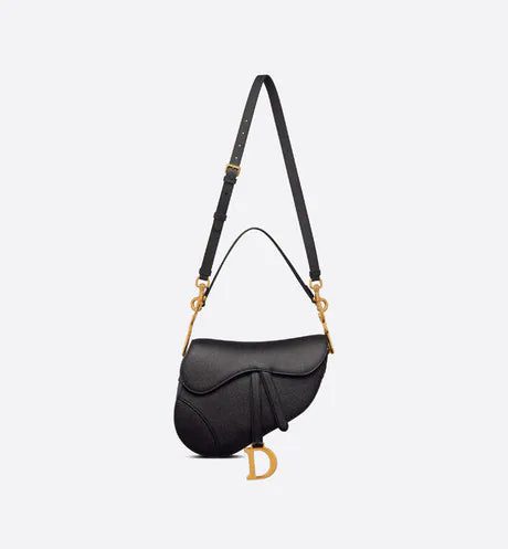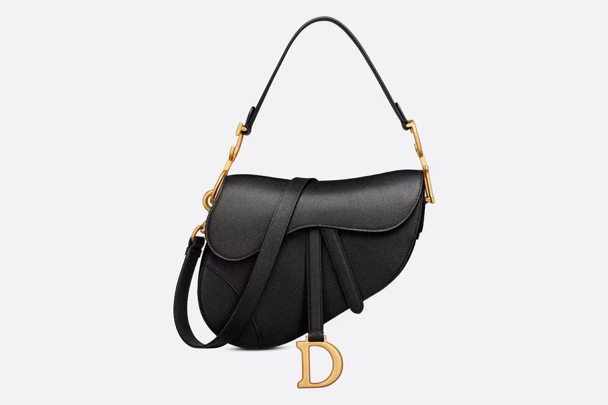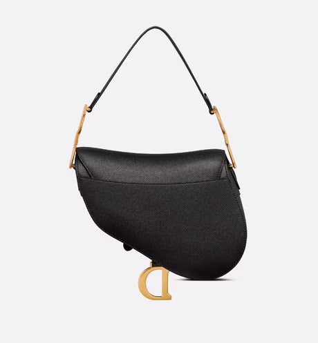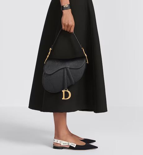 Maria Grazia Chiuri brings a fresh update to the iconic Saddle bag. Crafted in black grained calfskin, the legendary design presents a Saddle flap with a magnetic D stirrup clasp, as well as an antique gold-finish metal CD signature on either side of the strap. Featuring a thin, adjustable and removable shoulder strap, the Saddle bag may be carried by hand, worn over the shoulder or crossbody.