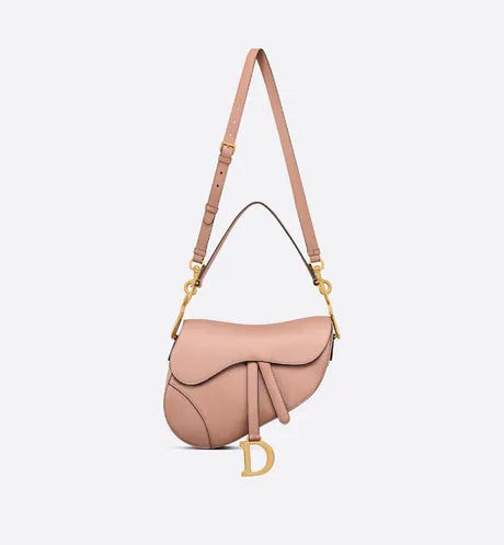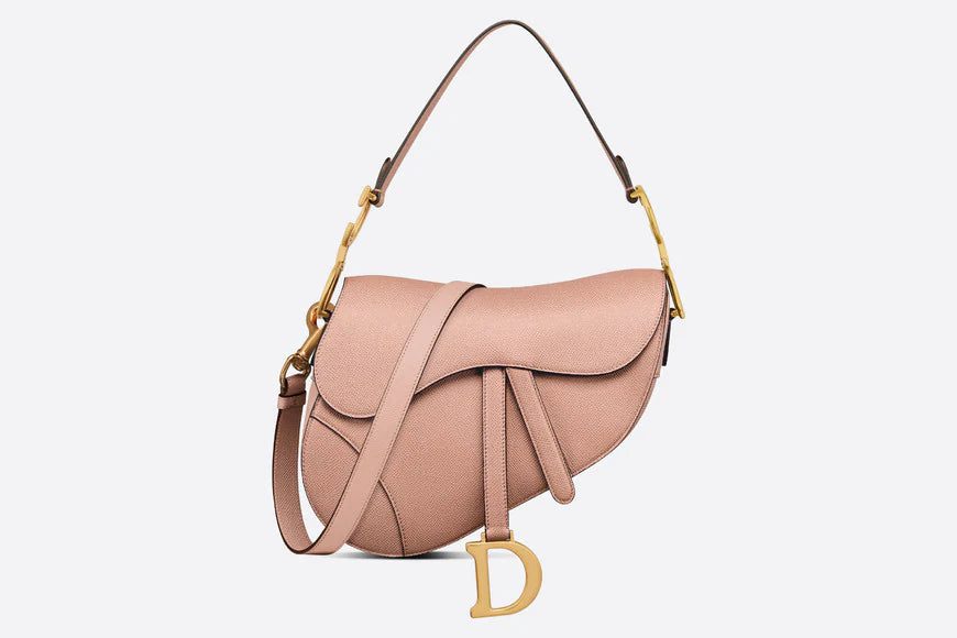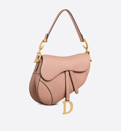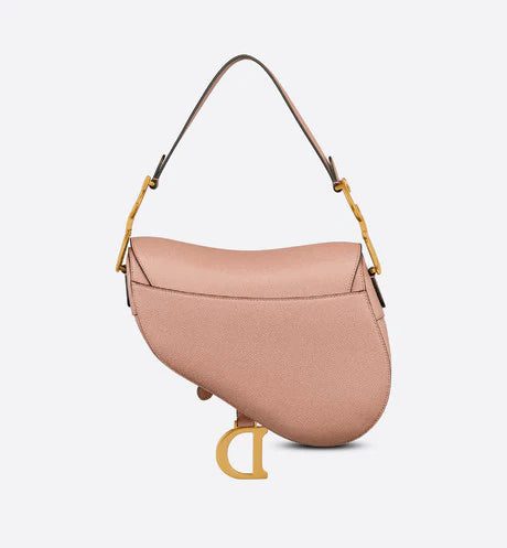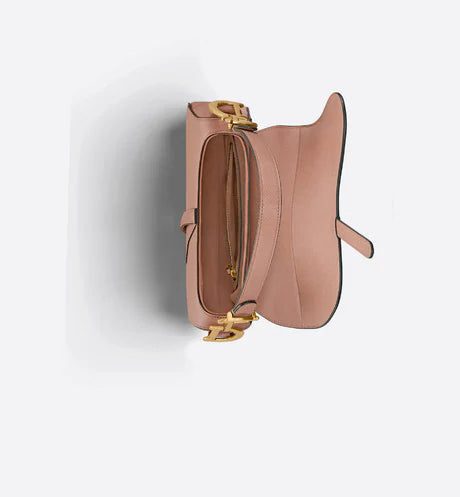 Maria Grazia Chiuri brings a fresh update to the iconic Saddle bag. Crafted in blush grained calfskin, the legendary design presents a Saddle flap with a magnetic D stirrup clasp, as well as an antique gold-finish metal CD signature on either side of the strap. Featuring a thin, adjustable and removable shoulder strap, the Saddle bag may be carried by hand, worn over the shoulder or crossbody.