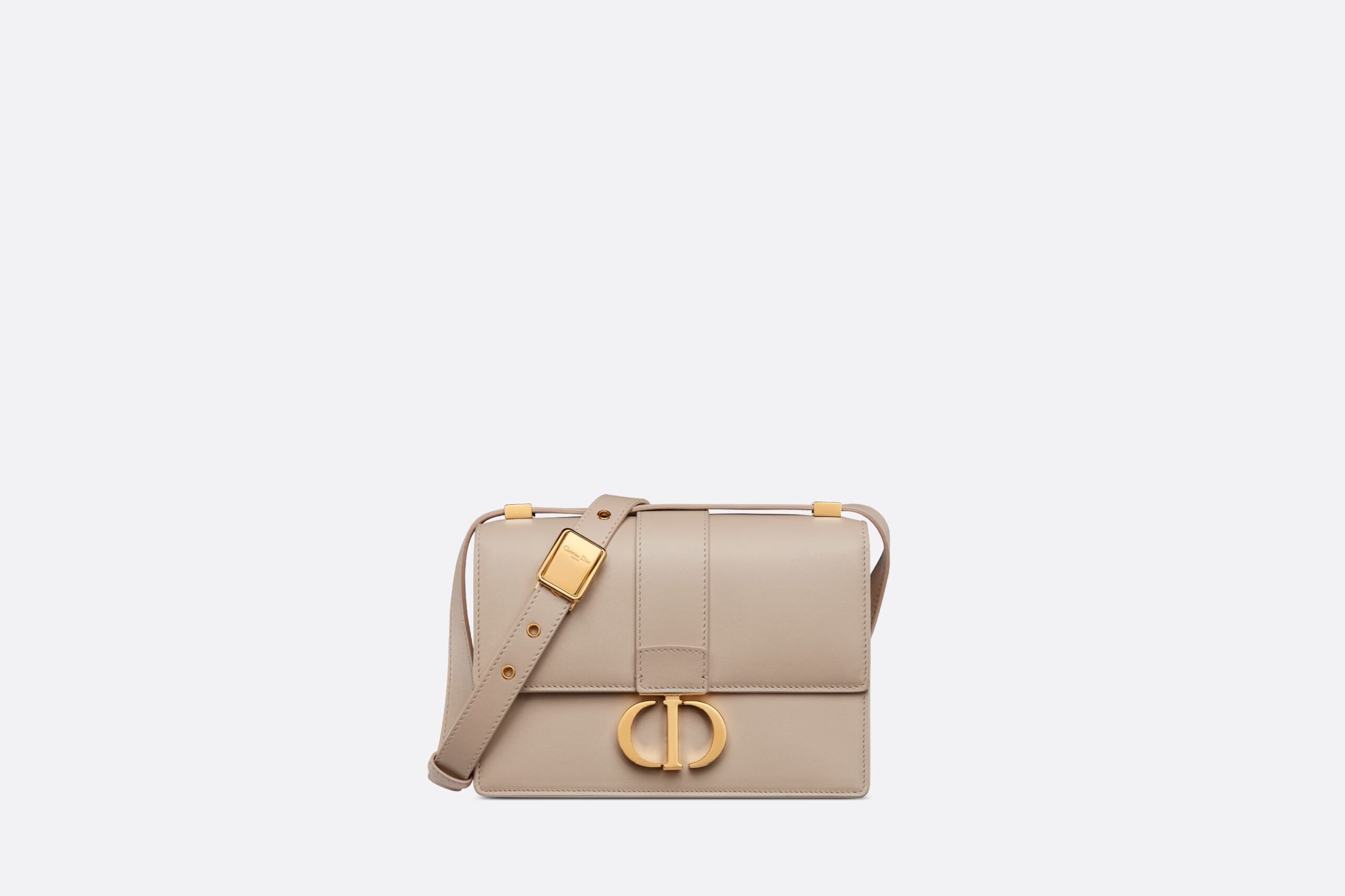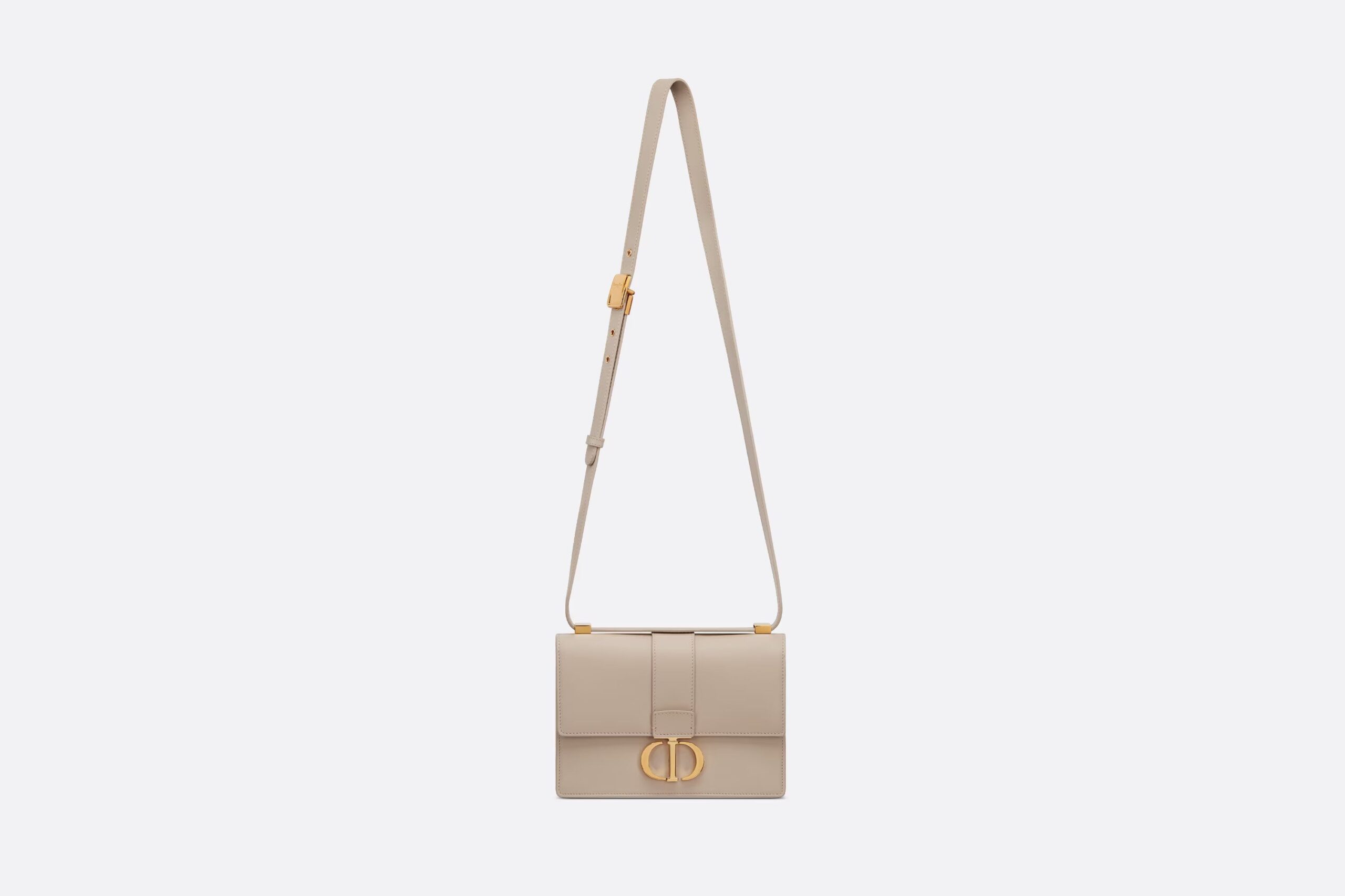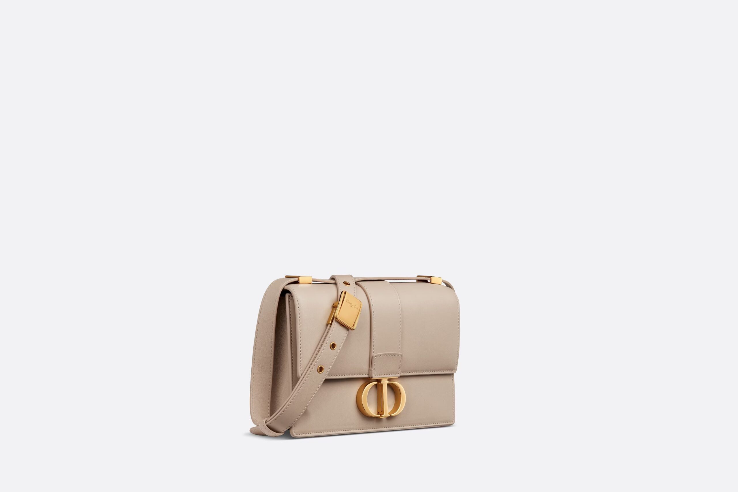 The bag enhances the 30 Montaigne line with a timeless and elegant design crafted in powder beige calfskin. The flap has an antique gold-finish metal CD clasp, inspired by the seal of a Christian Dior perfume bottle. Other details, like the embossed 30 Montaigne signature on the back and the military-inspired buckle, highlight the streamlined design. Featuring an adjustable leather shoulder strap, the small 30 Montaigne bag can be carried by hand, worn over the shoulder or crossbody.