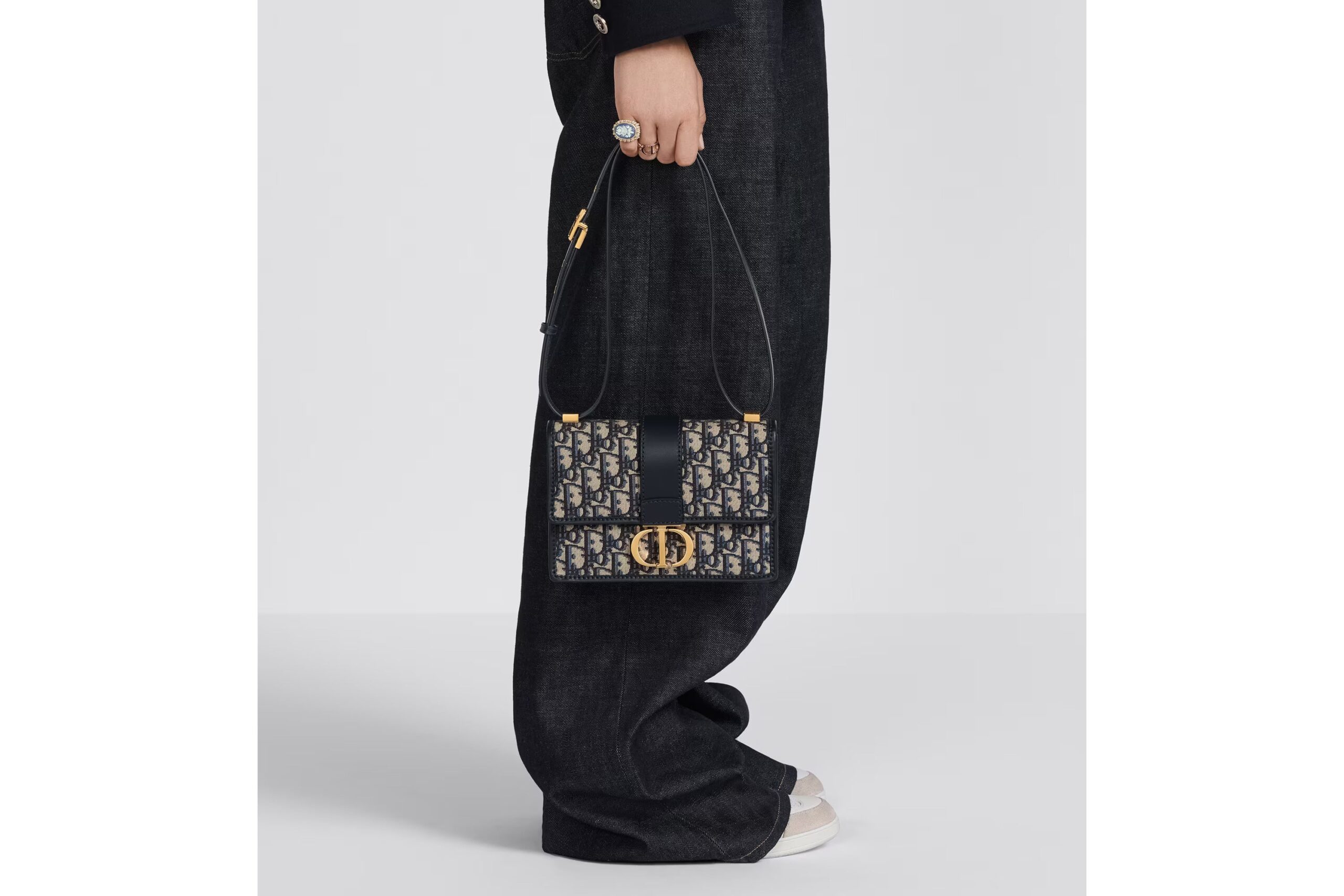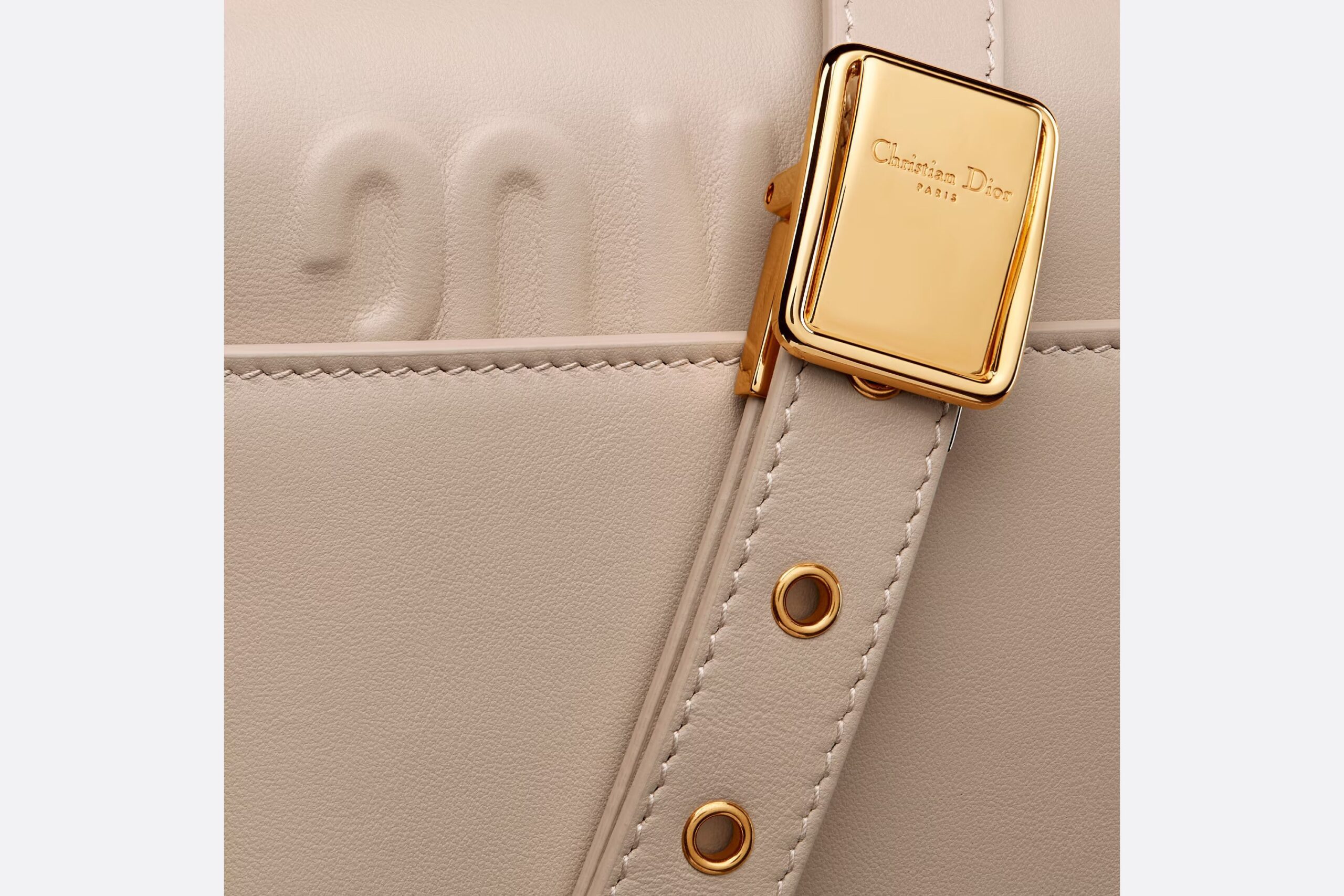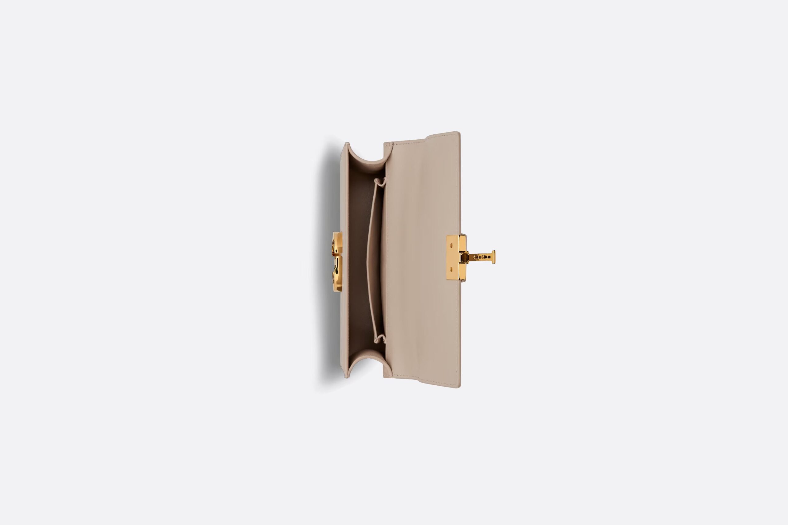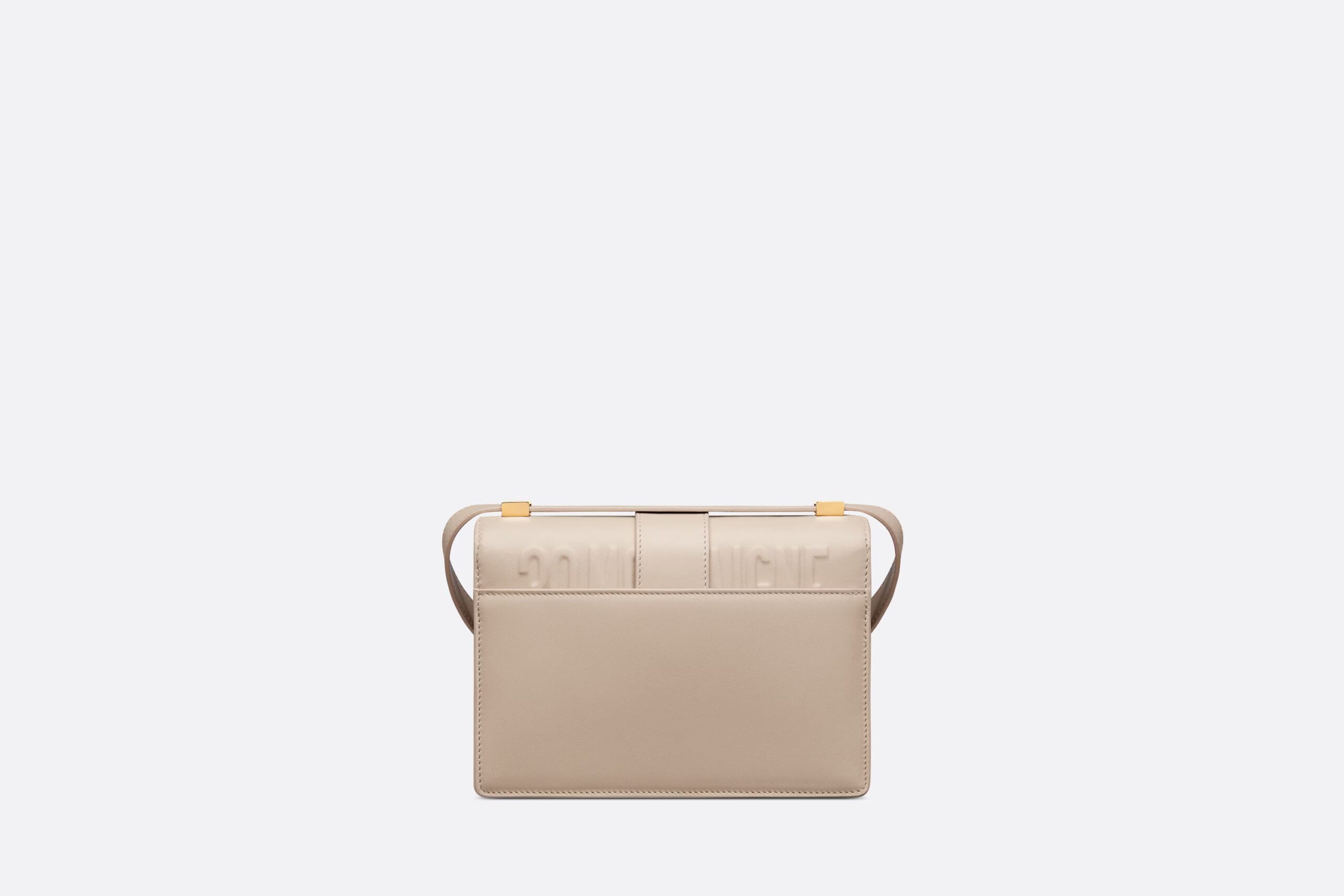 The bag enhances the 30 Montaigne line with a timeless and elegant design crafted in powder beige calfskin. The flap has an antique gold-finish metal CD clasp, inspired by the seal of a Christian Dior perfume bottle. Other details, like the embossed 30 Montaigne signature on the back and the military-inspired buckle, highlight the streamlined design. Featuring an adjustable leather shoulder strap, the small 30 Montaigne bag can be carried by hand, worn over the shoulder or crossbody.
