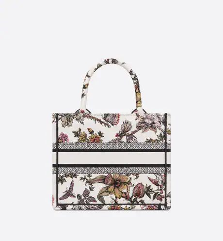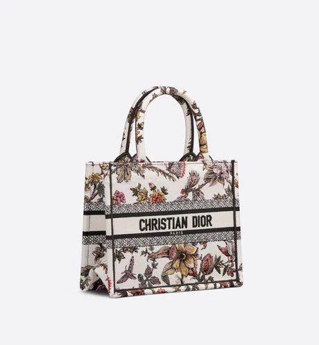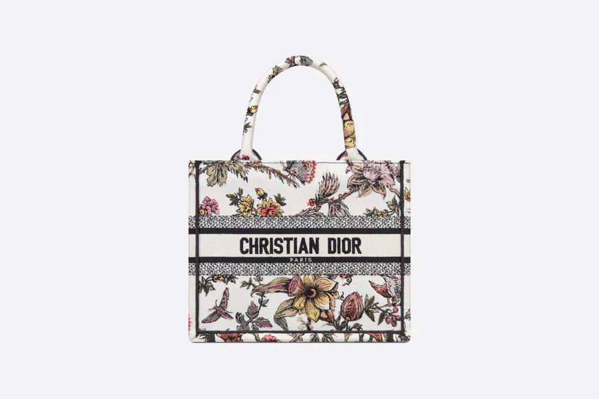 The Dior Book Tote is an original creation introduced by Maria Grazia Chiuri, Dior's Creative Director, and has become a staple of the Dior aesthetic. Designed to hold all the daily essentials, it is fully embroidered with the white multicolor Dior Jardin Botanique motif and presents a romantic floral pattern inspired by the Granville gardens so dear to Mr. Dior. Adorned with the Christian Dior Paris signature on the front, the small tote exemplifies the House's signature savoir-faire and may be carried by hand.
