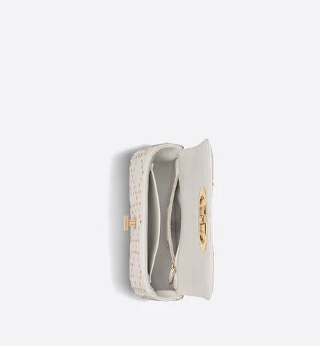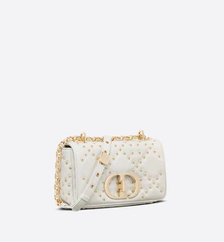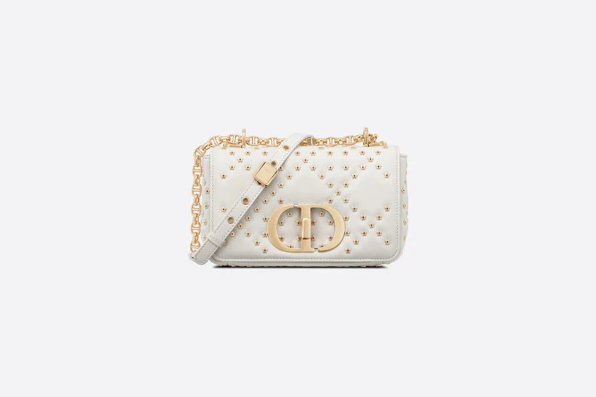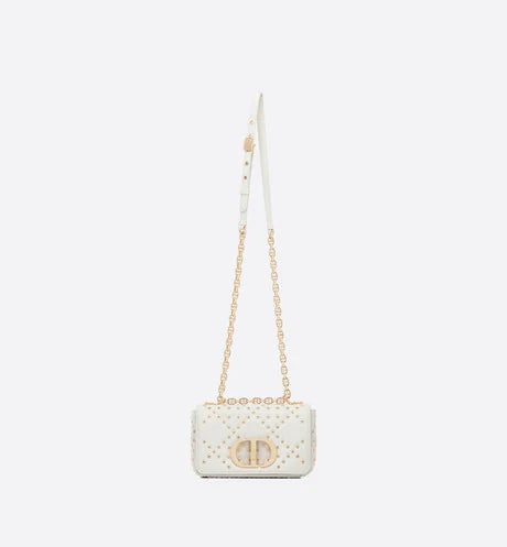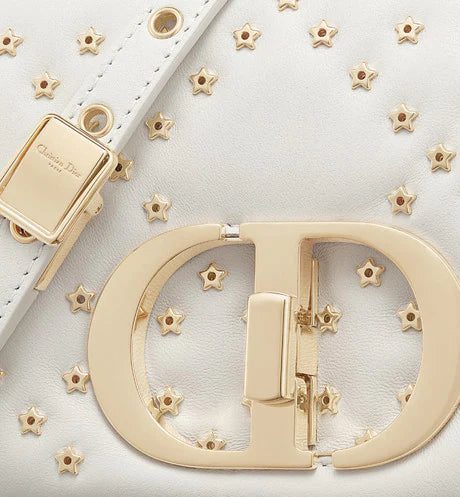 The Dior Caro bag combines modernity with timeless elegance. The design is crafted in latte lambskin with the Lucky Star Cannage motif, offering a new take on the iconic House motif. It features a flap adorned with an antique gold-finish metal 'CD' twist clasp, inspired by the seal of a Christian Dior perfume bottle. The detachable chain shoulder strap with 'CD' signature links allows it to be carried by hand, worn over the shoulder or crossbody. It may also be replaced by one of the House's wide embroidered straps, allowing the small bag to pair with day or evening attire.