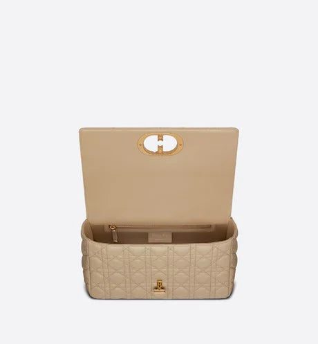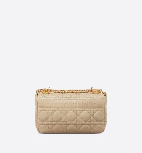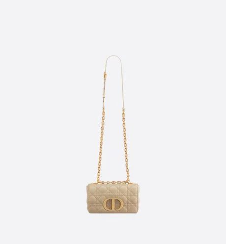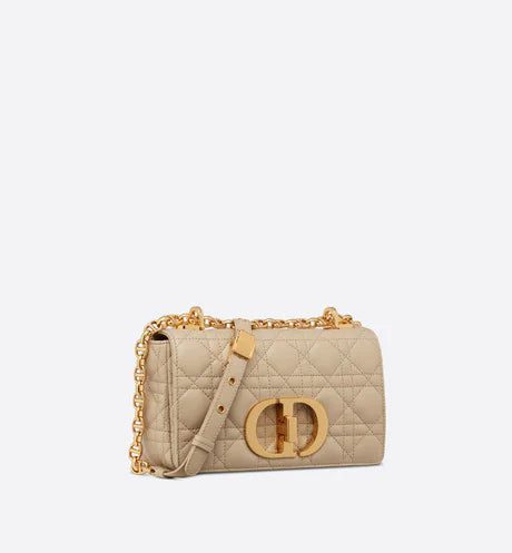 The Dior Caro bag combines modernity with timeless elegance. The design is crafted in beige supple calfskin with Cannage stitching. The bag features a flap adorned with an antique gold-finish metal 'CD' twist clasp, inspired by the seal of a Christian Dior perfume bottle. The detachable chain shoulder strap with 'CD' signature links allows it to be carried by hand, over the shoulder or crossbody, or replaced by one of the House's wide embroidered straps, allowing the small bag to pair with day or evening attire.
