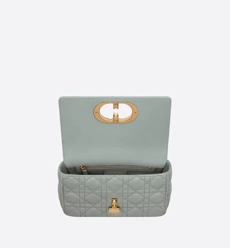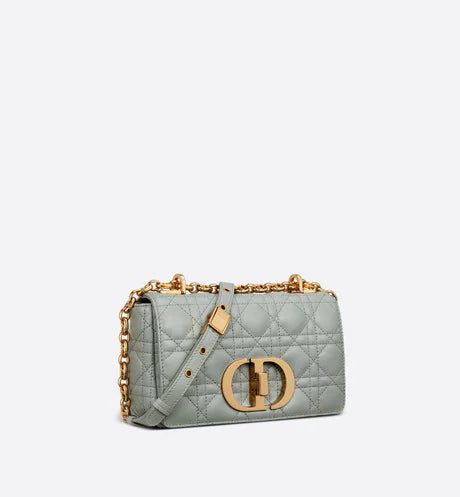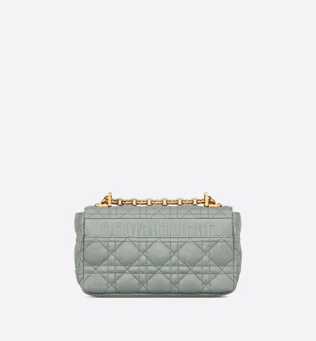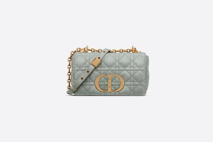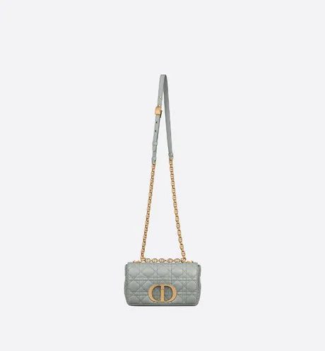The Dior Caro bag combines modernity with timeless elegance. The design is crafted in gray supple calfskin with Cannage stitching. The bag features a flap adorned with an antique gold-finish metal 'CD' twist clasp, inspired by the seal of a Christian Dior perfume bottle. The detachable chain shoulder strap with 'CD' signature links allows it to be carried by hand, over the shoulder or crossbody, or replaced by one of the House's wide embroidered straps, allowing the small bag to pair with day or evening attire.