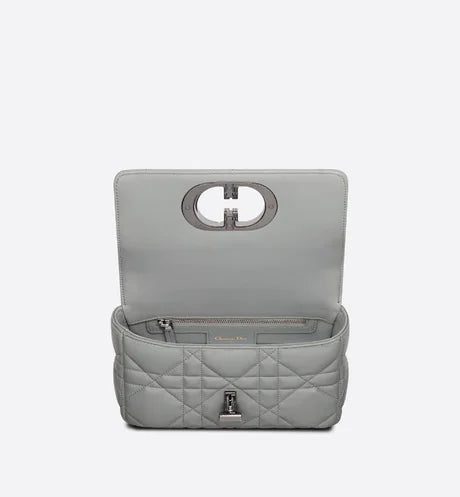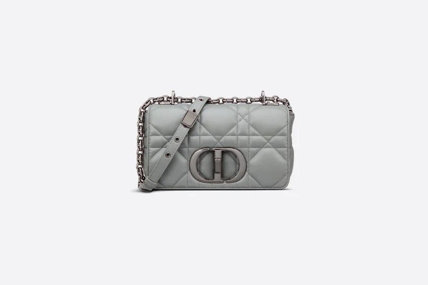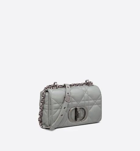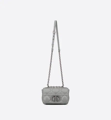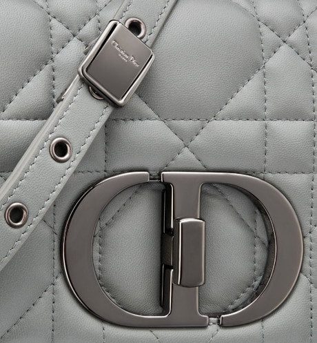 The Dior Caro bag combines modernity with timeless elegance. The design is crafted in gray calfskin and is distinguished by its original quilted-effect Macrocannage stitching, as well as a flap adorned with a ruthenium-finish metal 'CD' twist clasp, inspired by the seal of a Christian Dior perfume bottle. The detachable chain shoulder strap with 'CD' signature links allows the small bag to be carried by hand, worn over the shoulder or crossbody, and can be replaced by one of the House's wide embroidered straps for day or evening attire.