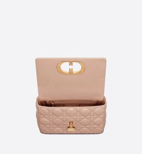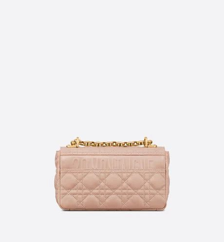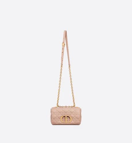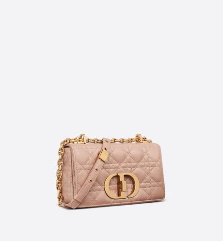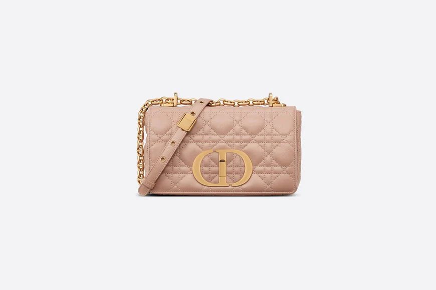 The new Dior Caro bag boasts Cannage stitching on Rose des Vents calfskin, showcasing the instantly recognizable quilted texture. The supple bag features a flap with the twist 'CD' clasp, inspired by the seal of a Christian Dior perfume bottle, styled in antique gold-finish metal. The removable signature 'CD' chain link shoulder strap can be replaced with a wide embroidered strap, allowing the small style to be worn during both the day and the evening for a modern, elegant look.