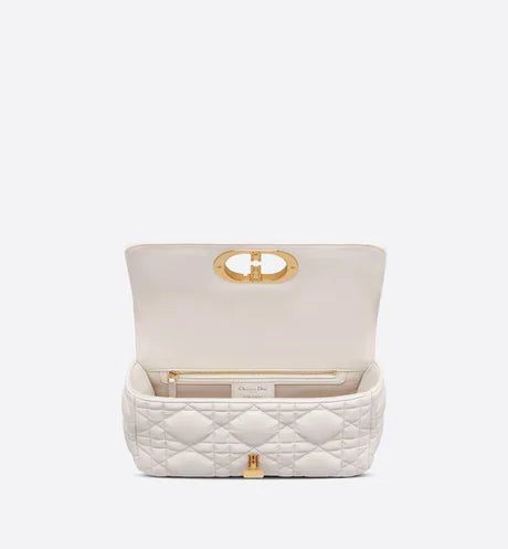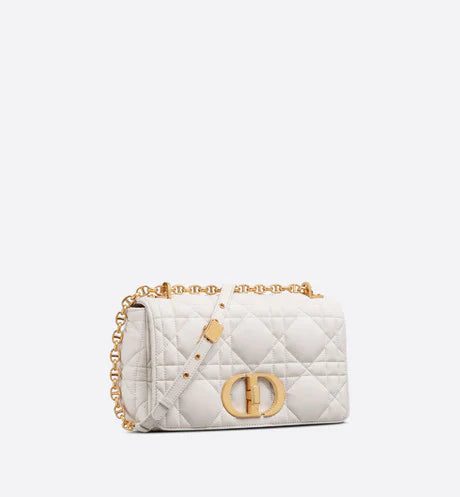 The Dior Caro bag combines modernity with timeless elegance. The design is crafted in latte matte calfskin and is distinguished by its original quilted-effect Macrocannage stitching. The bag features a flap adorned with an antique gold-finish metal 'CD' twist clasp, inspired by the seal of a Christian Dior perfume bottle. The detachable chain shoulder strap with 'CD' signature links allows the small bag to be carried by hand or worn over the shoulder and may be replaced by one of the House's wide embroidered straps for day or evening attire.