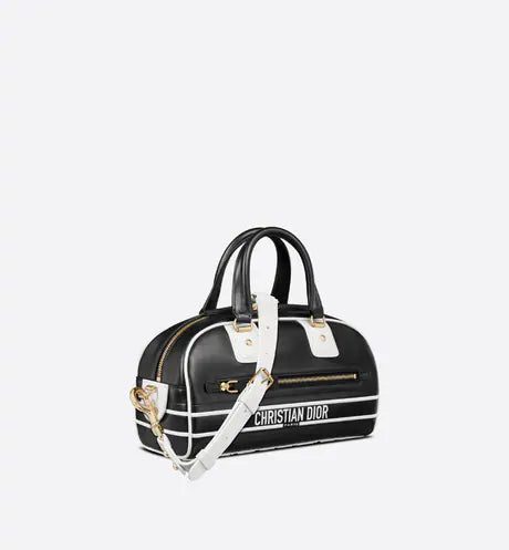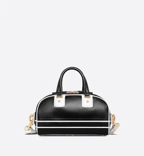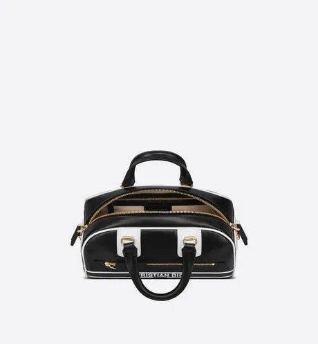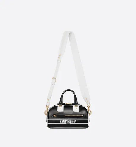 The Dior Vibe Zip Bowling bag by Maria Grazia Chiuri combines sportswear codes with the House's couture spirit crafted in black and white smooth calfskin. A 'CHRISTIAN DIOR PARIS' signature highlights a front zipped pocket, while the tonal rubber underside of the bag features a star motif inspired by Dior sneakers. The small bag can be paired with Dior Vibe sneakers to complete the look.