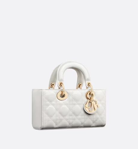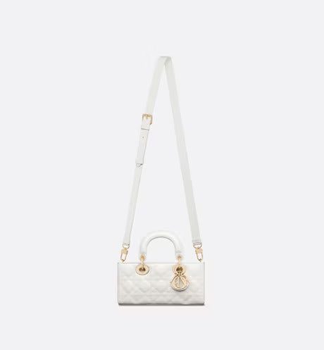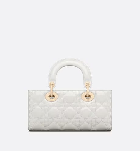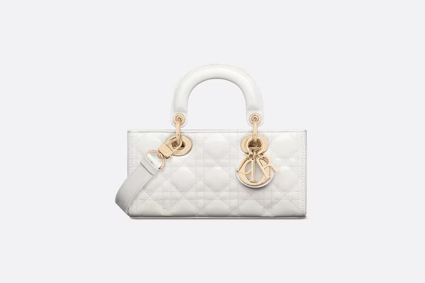 The Lady D-Joy bag captures the House's vision of elegance and beauty by showcasing the iconic streamlined aesthetic of the Lady Dior line. Crafted in latte patent calfskin with Cannage stitching, the legendary quilted texture is immediately recognizable. Pale gold-finish metal D.I.O.R. charms embellish and illuminate its silhouette. Featuring one removable chain strap and another adjustable and removable leather strap, the small Lady D-Joy bag can be carried by hand, worn over the shoulder or crossbody as a daily companion.