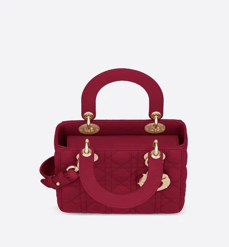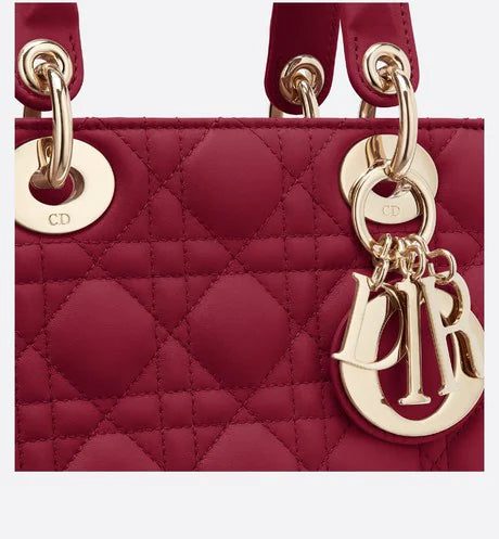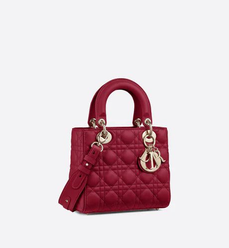The Lady Dior My ABCDior bag epitomizes Dior's vision of elegance and beauty. Sleek and refined, the timeless style is crafted in cherry red lambskin with Cannage stitching, creating the instantly recognizable quilted texture. Pale gold-finish metal 'D.I.O.R.' charms further embellish its silhouette with an elegant allure. Featuring a shoulder strap that can be personalized with badges, the small, unique design may be carried by hand or worn crossbody.