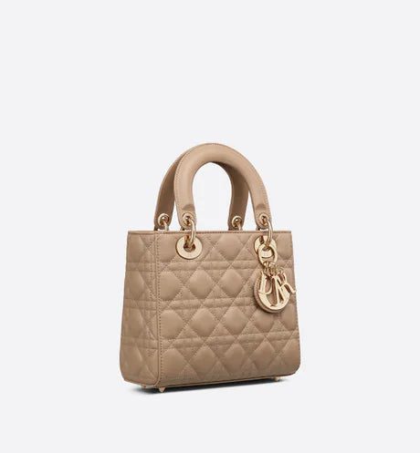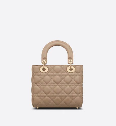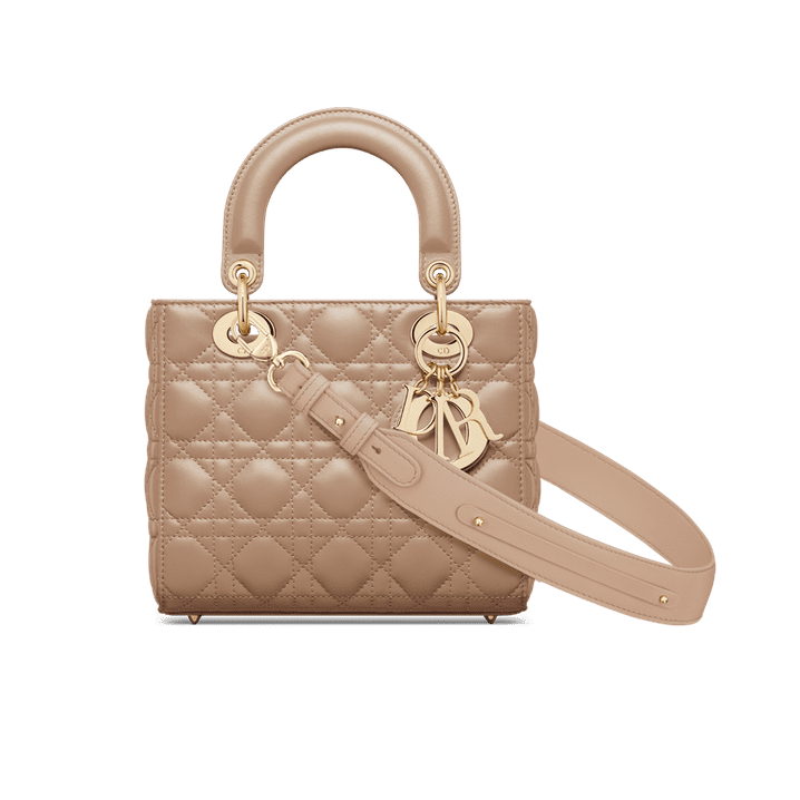 The Lady Dior My ABCDior bag epitomizes the House's vision of elegance and beauty. Sleek and refined, the timeless style is crafted in hazelnut lambskin with Cannage stitching, creating the instantly recognizable quilted texture, while the pale gold-finish metal 'D.I.O.R.' charms embellish and illuminate the silhouette. Featuring a shoulder strap that can be customized by adding badges, the small, unique style may be carried by hand or worn crossbody.