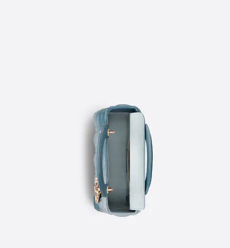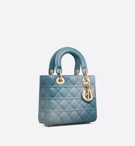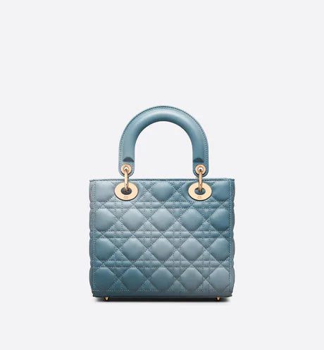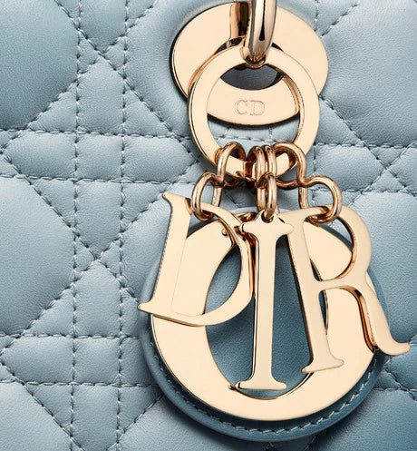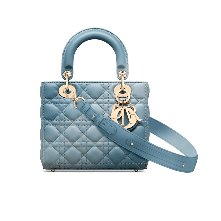 The Lady Dior My ABCDior bag epitomizes the House's vision of elegance and beauty. Sleek and refined, the timeless style is crafted in denim blue lambskin with Cannage stitching, creating the instantly recognizable quilted texture enhanced by a gradient finish. The pale gold-finish metal 'D.I.O.R.' charms offer an elegant allure. Featuring a shoulder strap that can be customized by adding badges, the small, unique style may be carried by hand, worn over the shoulder or crossbody.
