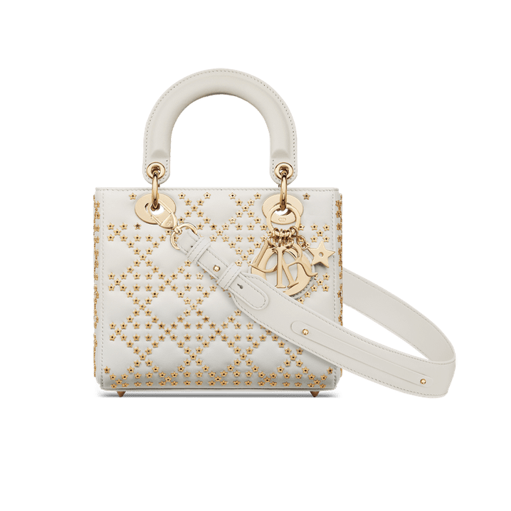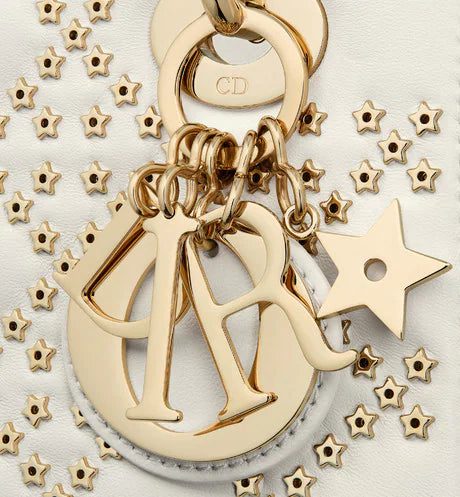 The Lady Dior My ABCDior bag epitomizes Dior's vision of elegance and beauty. Sleek and refined, the creation is timeless. Crafted in latte Lucky Star Cannage lambskin, the style offers a new take on the iconic motif with hand-applied stars. Pale gold-finish metal 'D.I.O.R.' charms offer an elegant allure. The unique, small design may be personalized with badges placed on its shoulder strap and can be carried by hand or worn crossbody.