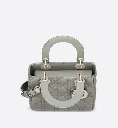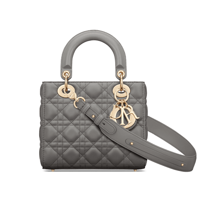 The Lady Dior My ABCDior bag epitomizes Dior's vision of elegance and beauty. Sleek and refined, the timeless style is crafted in gray lambskin with Cannage stitching, creating the instantly recognizable quilted texture. Pale gold-finish metal 'D.I.O.R.' charms offer an elegant allure. Featuring a shoulder strap that can be personalized with badges, the small, unique design may be carried by hand or worn crossbody.