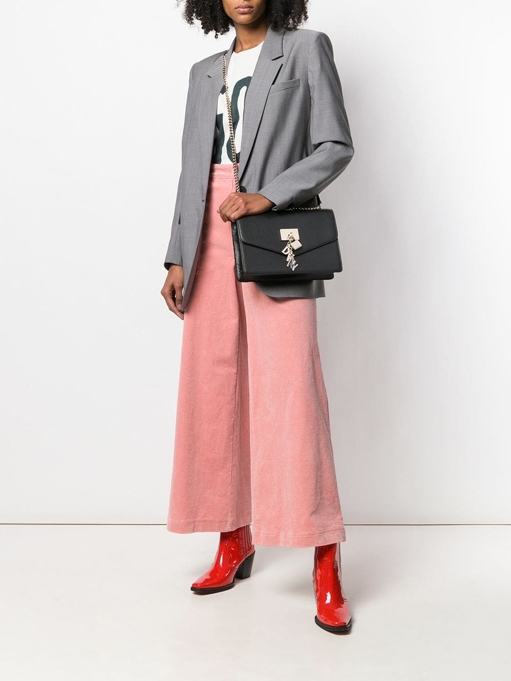 This black leather large Elissa shoulder bag from DKNY features a foldover top with magnetic closure, hanging padlock detail, gold-tone hardware, a gold-tone chain shoulder strap and an internal zipped pocket.