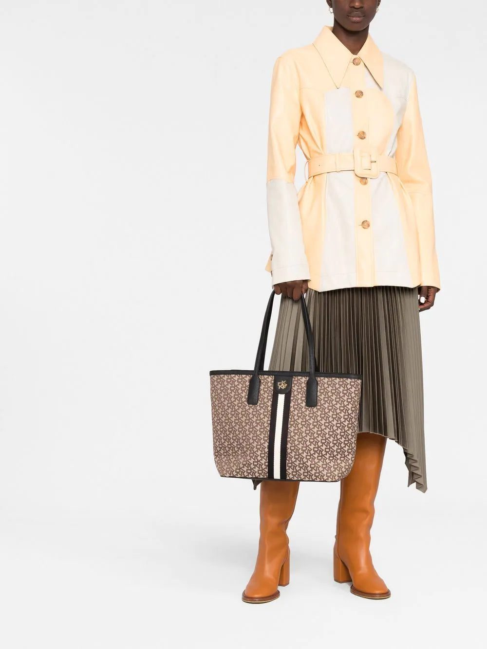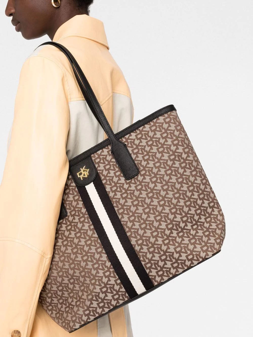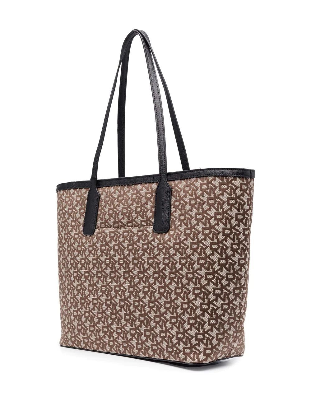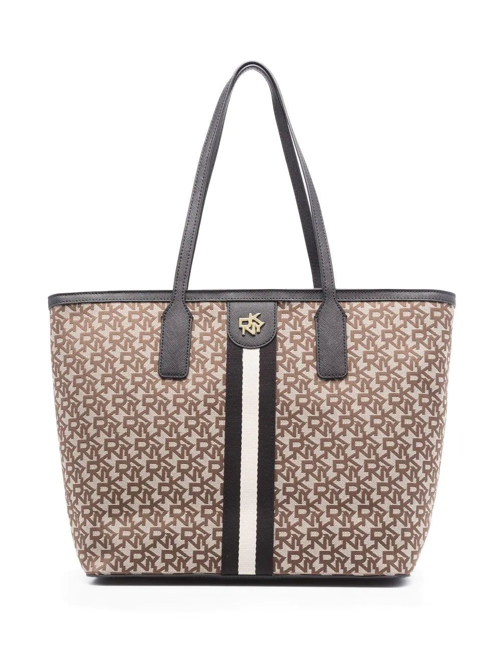 Branded detailing is at the core of DKNY's aesthetic, who chooses a sophisticated beige logo print to adorn this tote bag. The roomy accessory is zipped at the top and features a practical pocket inside.