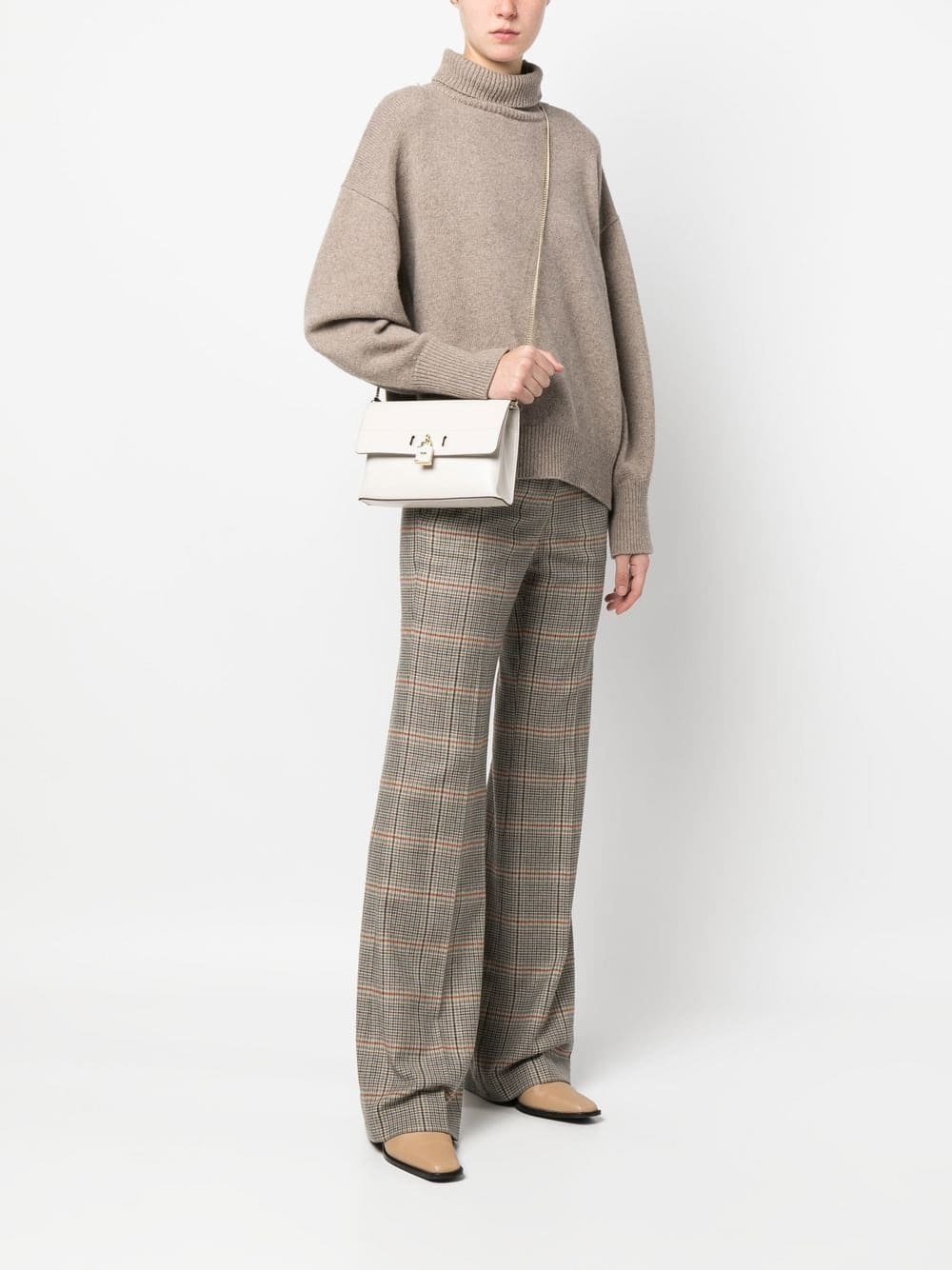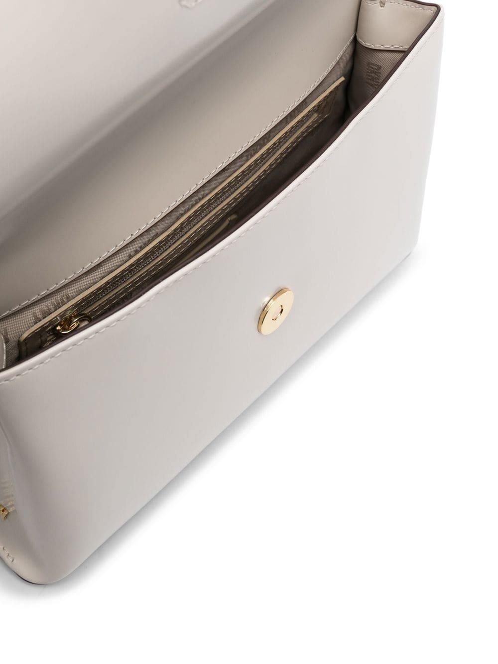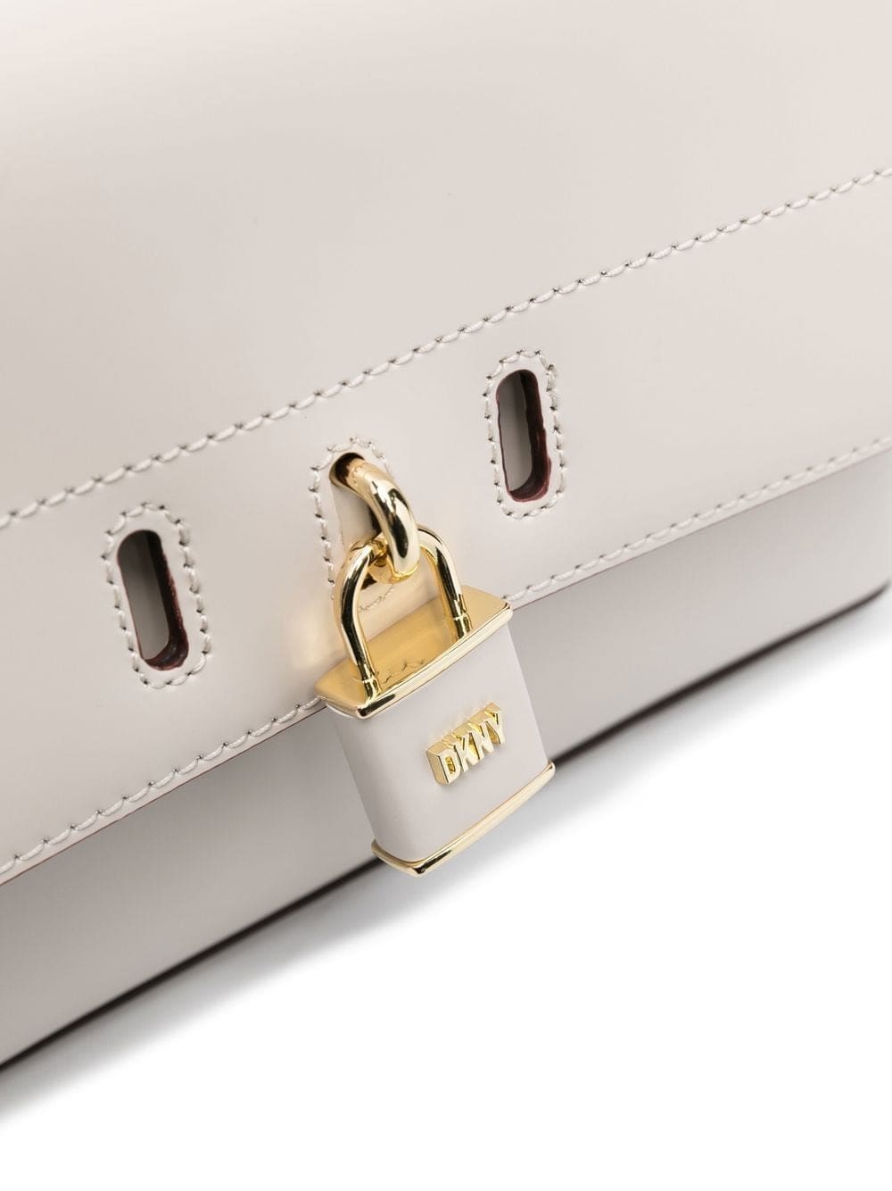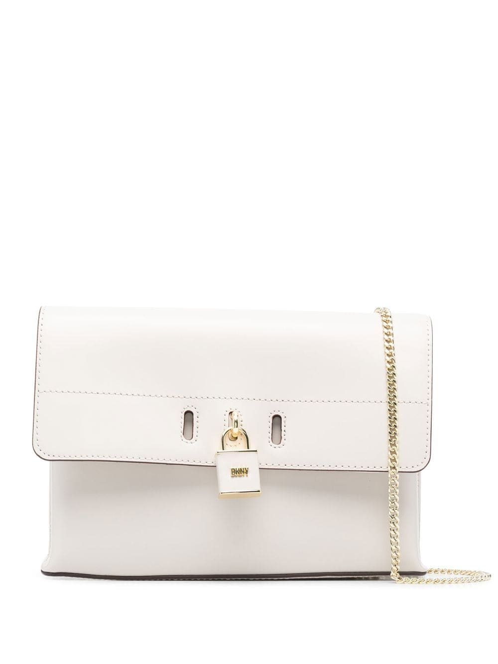 cream white calf leather padlock detail gold-tone logo lettering foldover top with magnetic fastening chain-link shoulder strap main compartment internal logo patch internal zip-fastening pocket