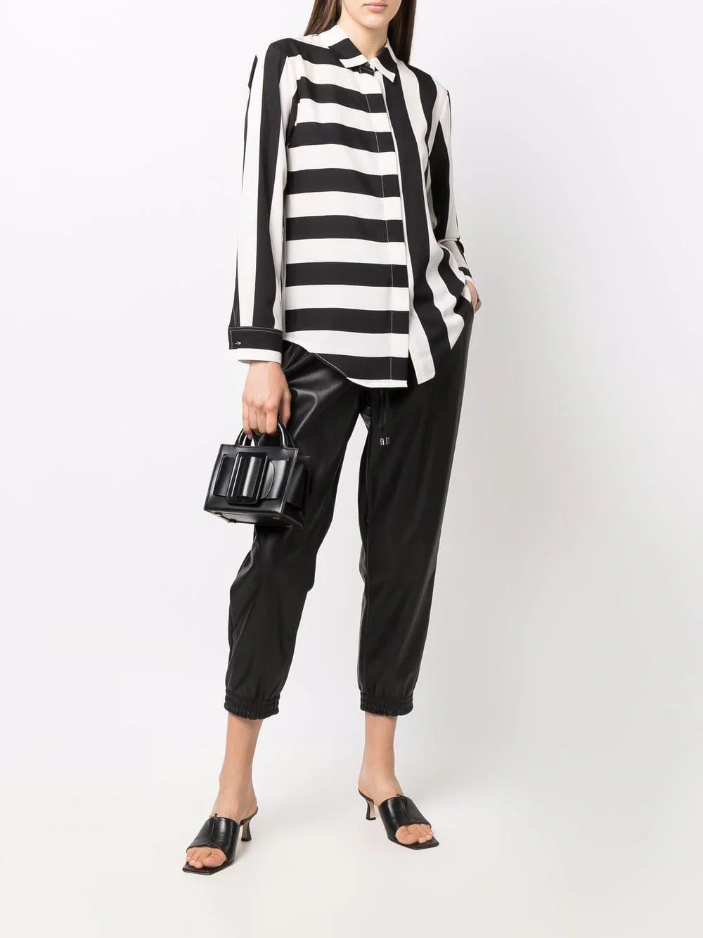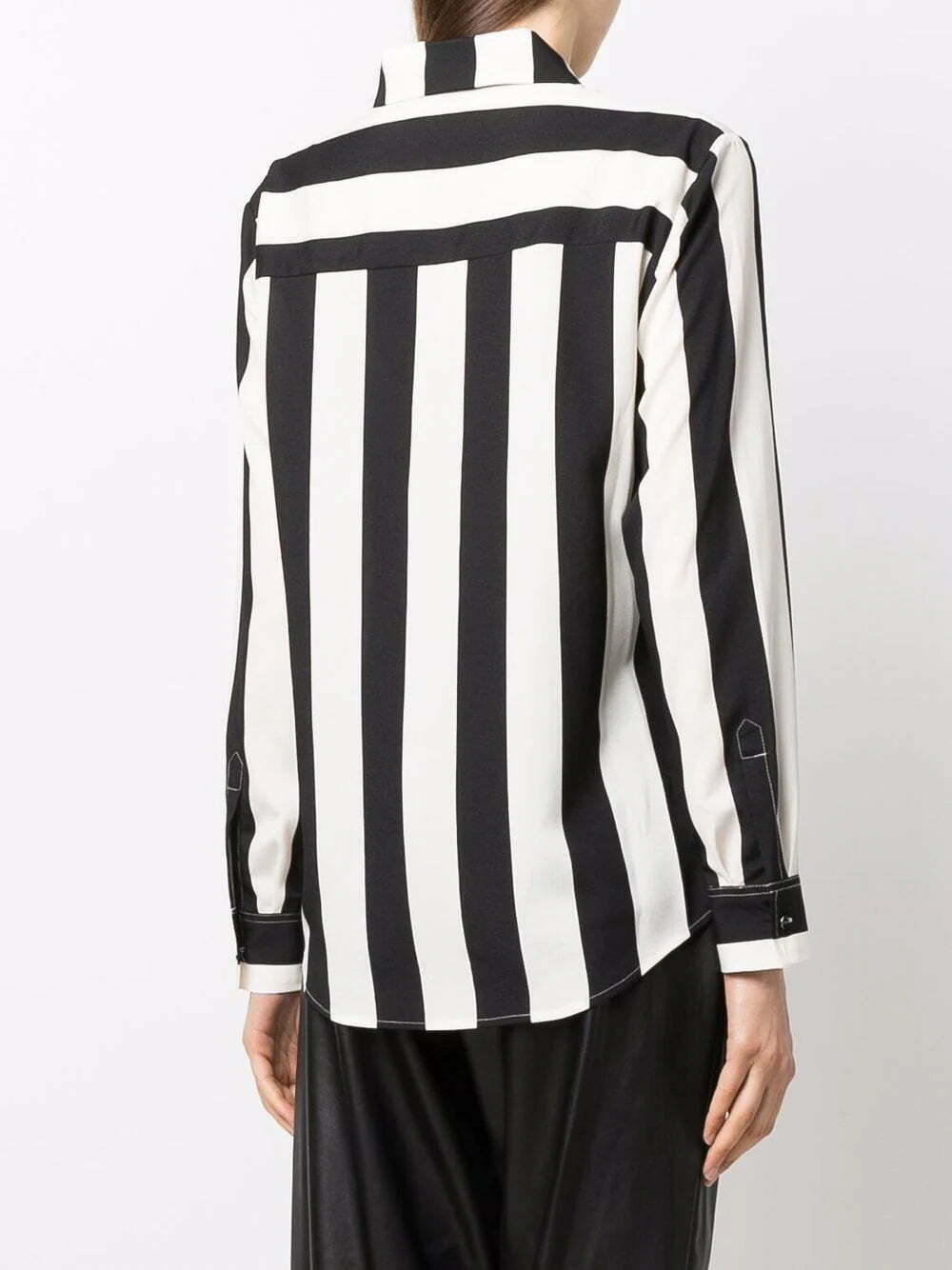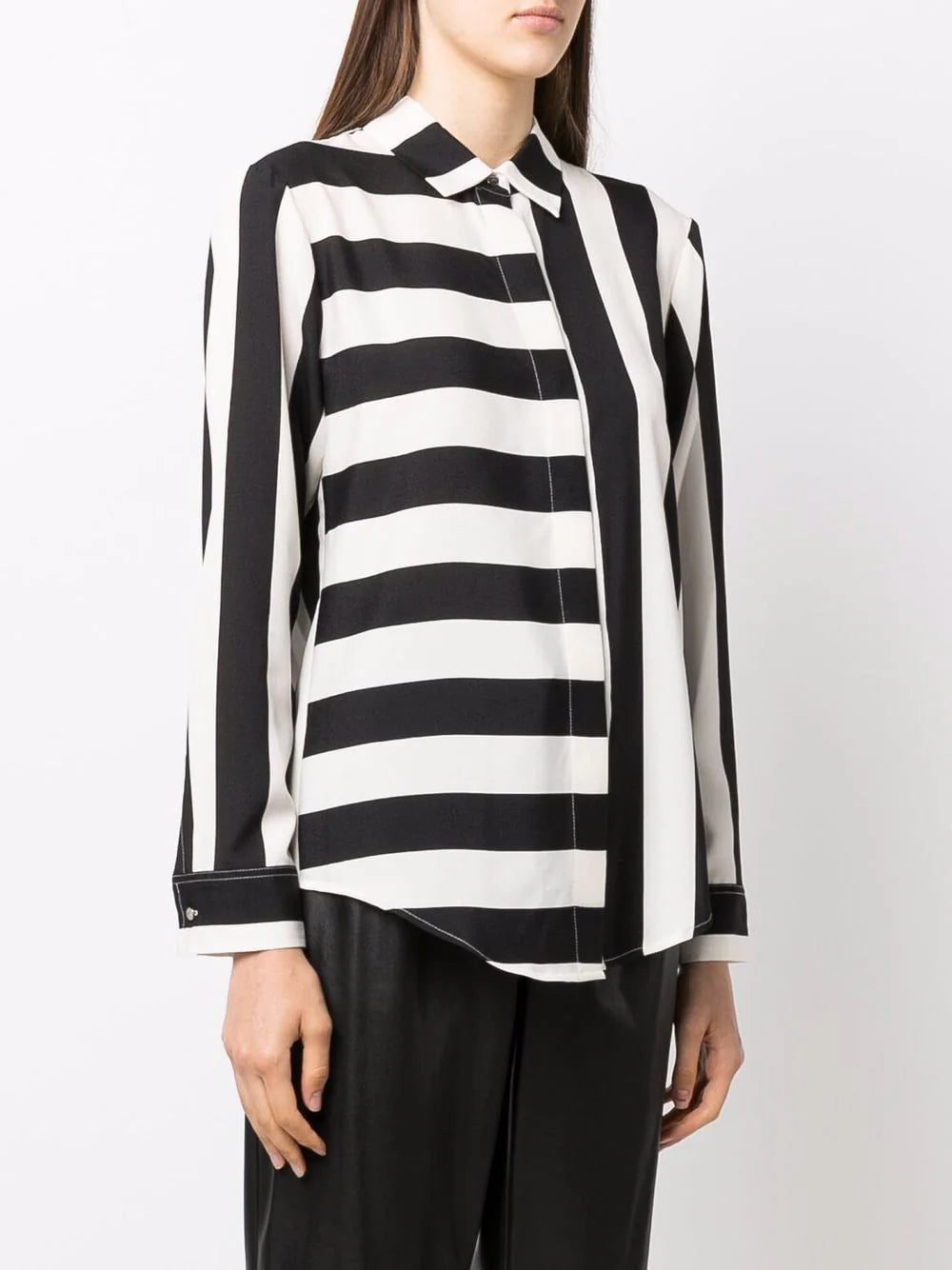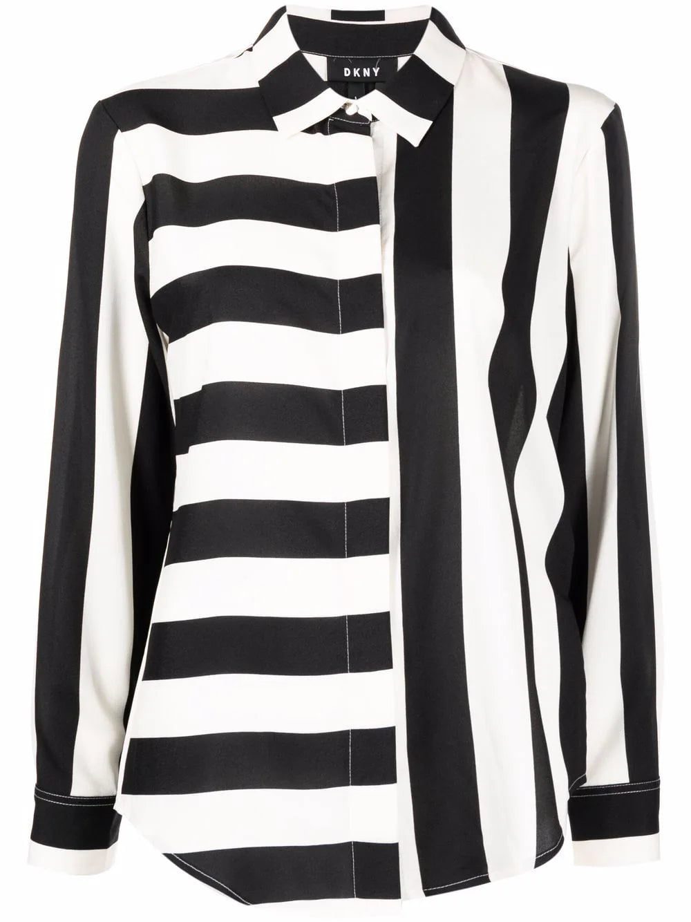 striped print shirt from DKNY featuring black, ivory white, horizontal stripe print, vertical stripe print, classic collar, front button placket, long sleeves, buttoned cuffs and curved hem.
