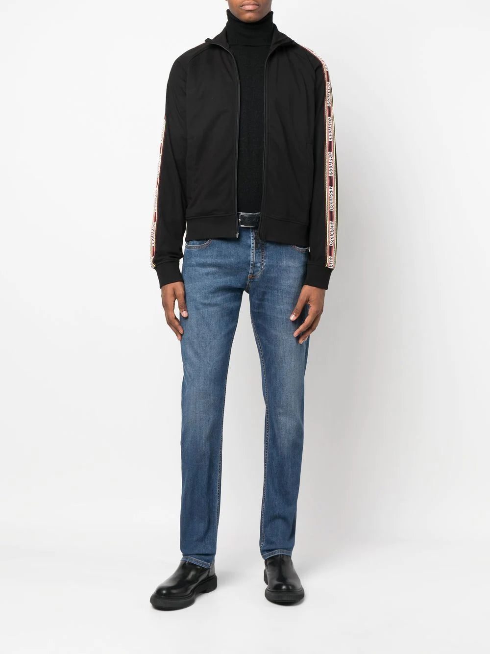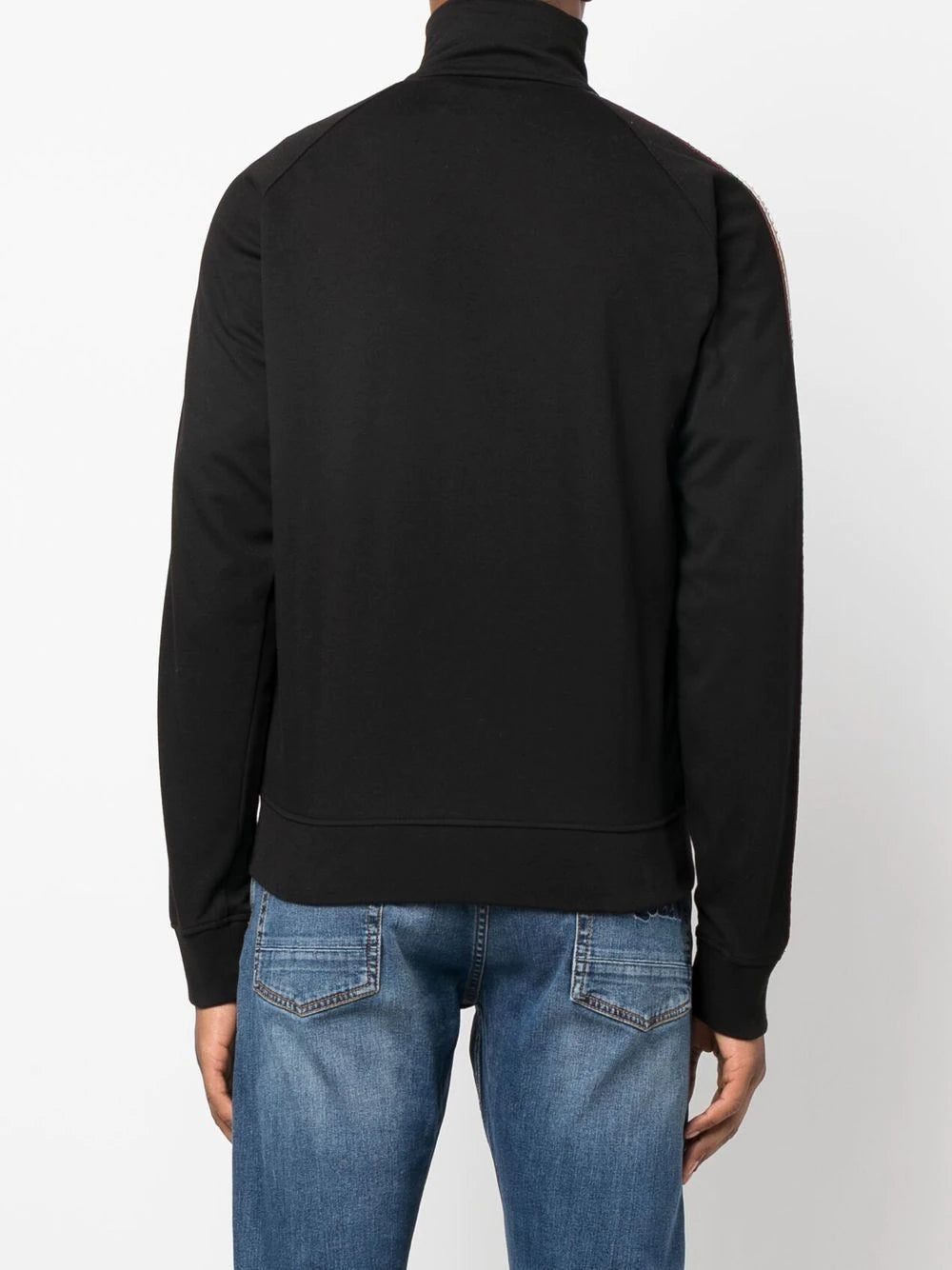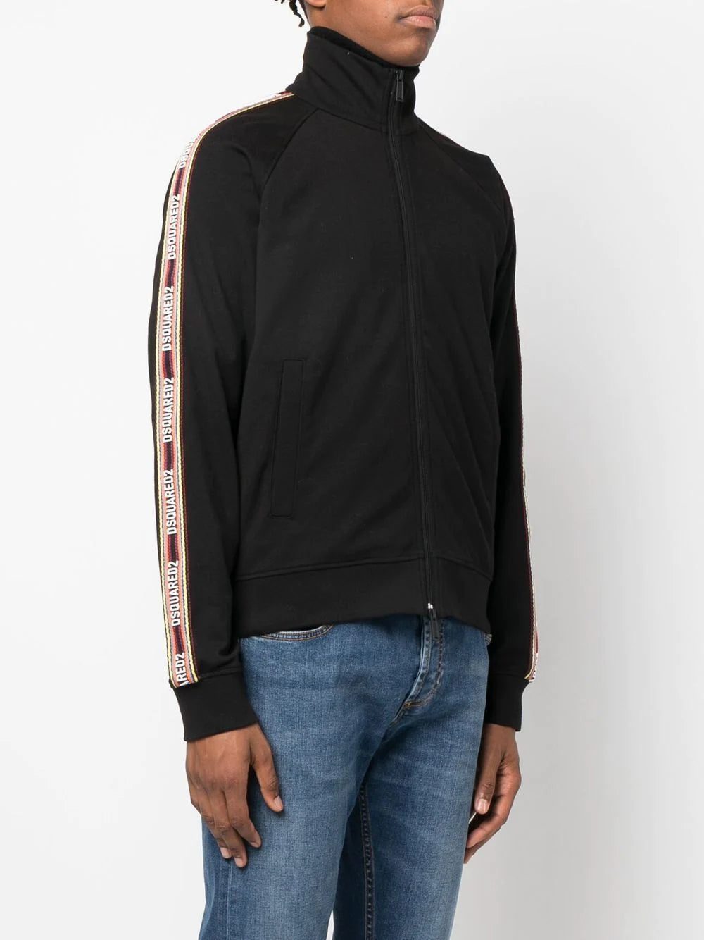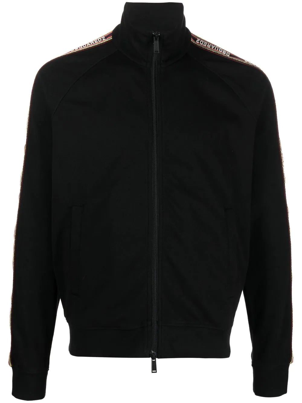 embroidered-logo zip-up sweatshirt from DSQUARED2 featuring jet black, embroidered logo at the sleeve, tape detailing, high neck, front zip fastening, two side slit pockets and straight hem.