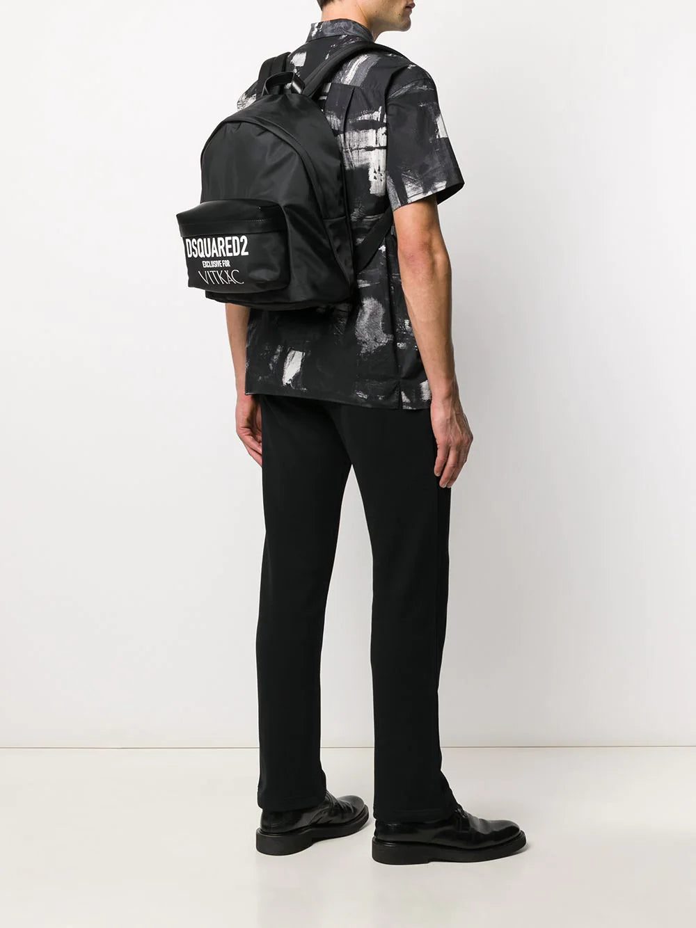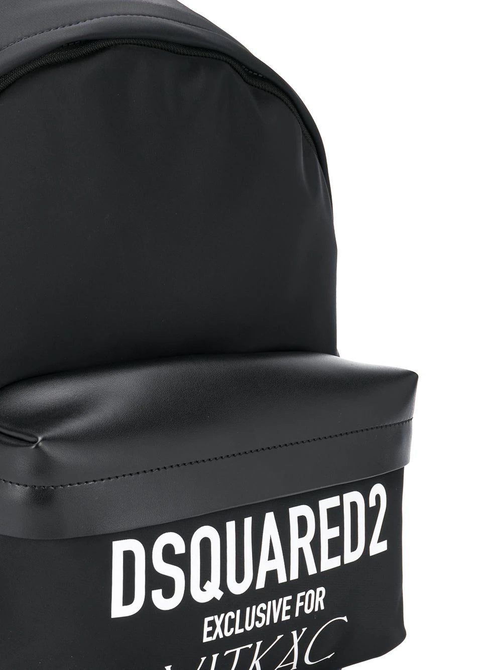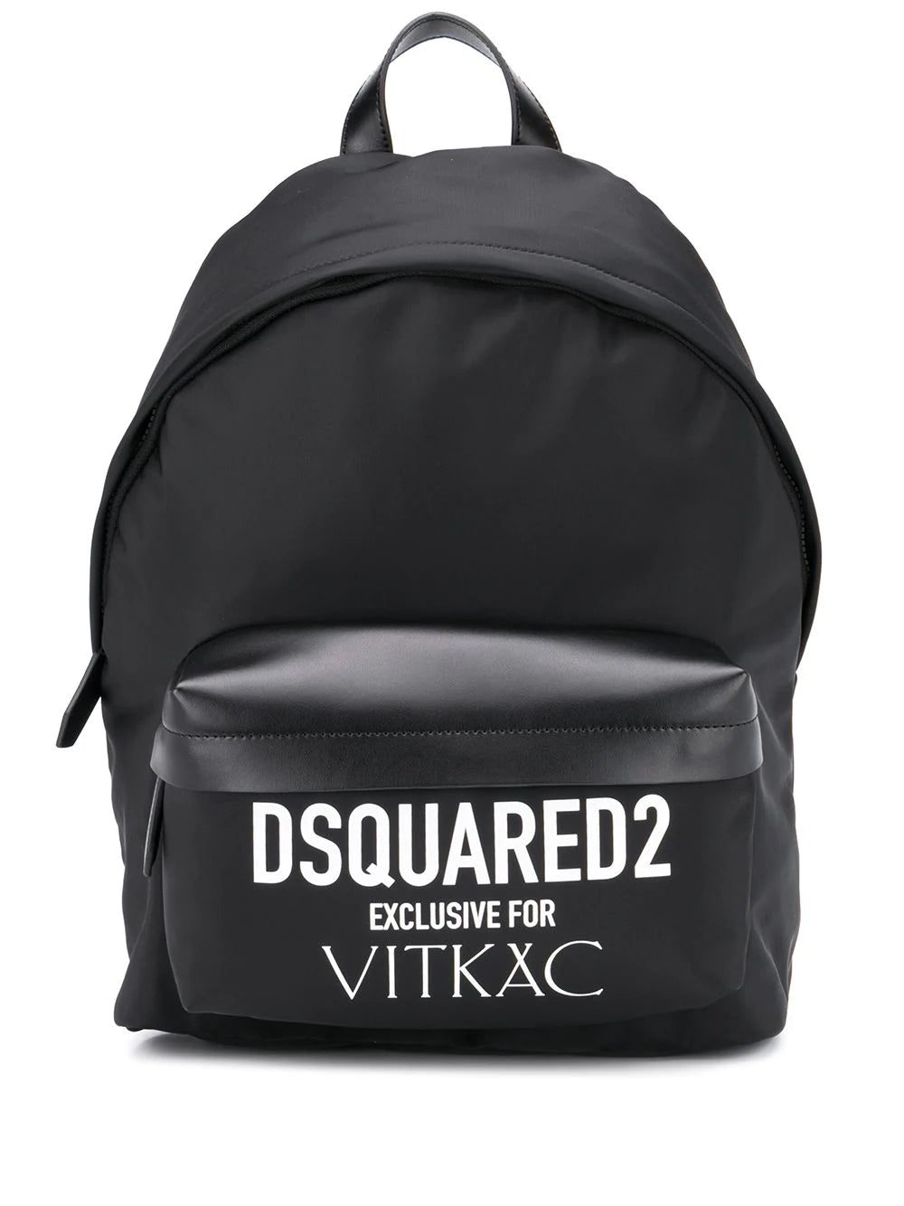 Black leather Exclusive for Vitkac backpack from DSQUARED2 featuring a printed logo to the front, a front zip pocket, a top handle, adjustable shoulder straps, a top zip fastening and an internal zipped pocket. Please note this is an exclusive piece.