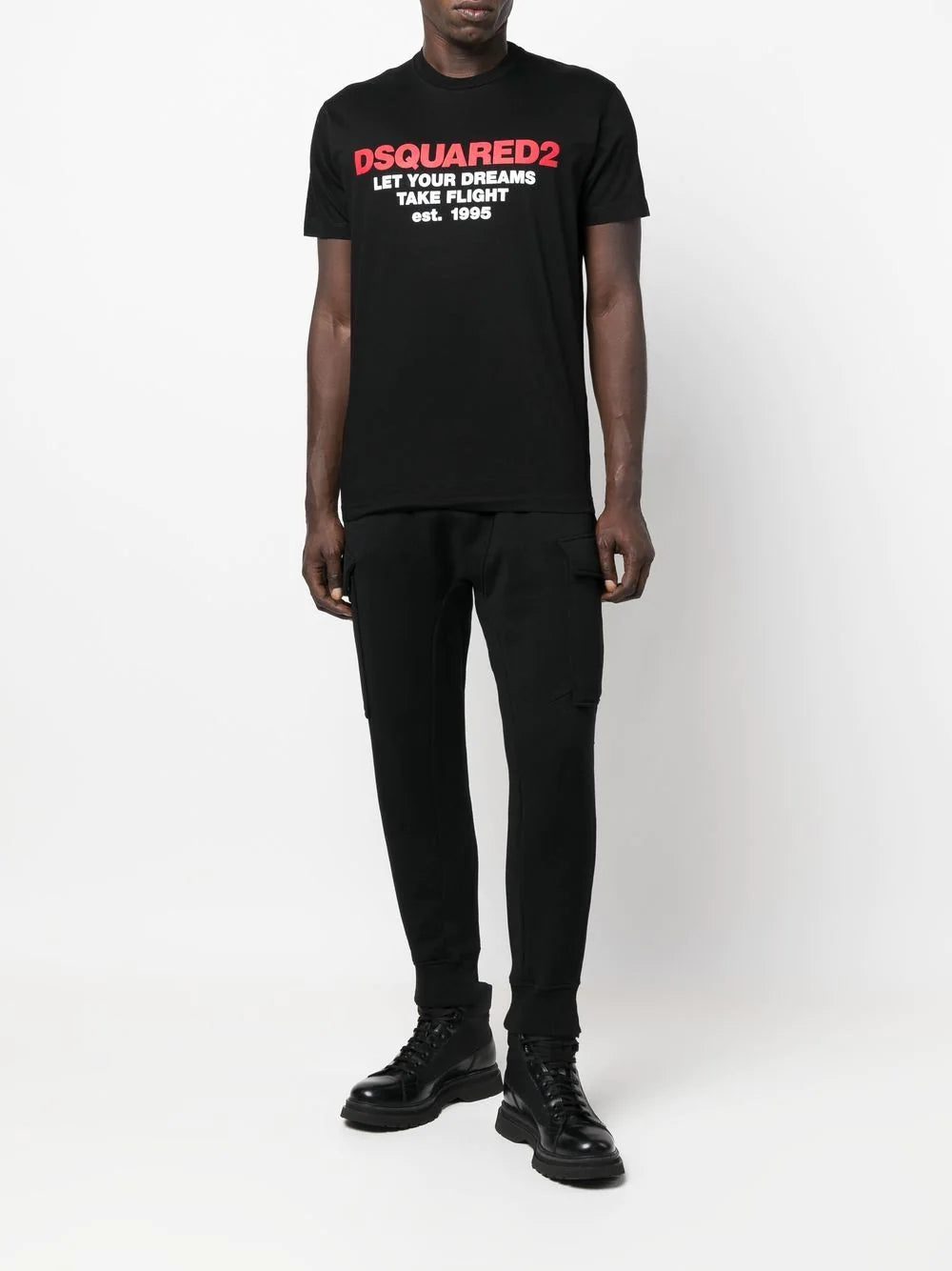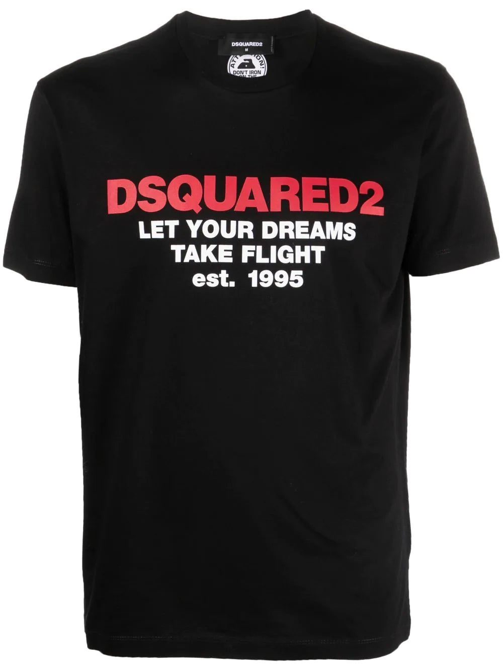 slogan logo-print T-shirt from DSQUARED2 featuring black, cotton, logo print at the chest, slogan print, crew neck, short sleeves and straight hem.