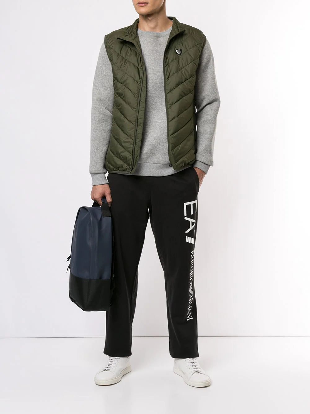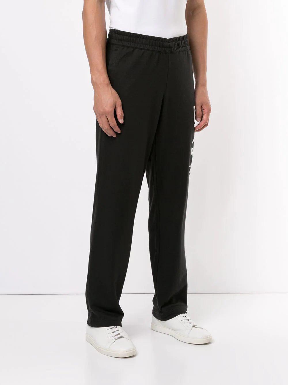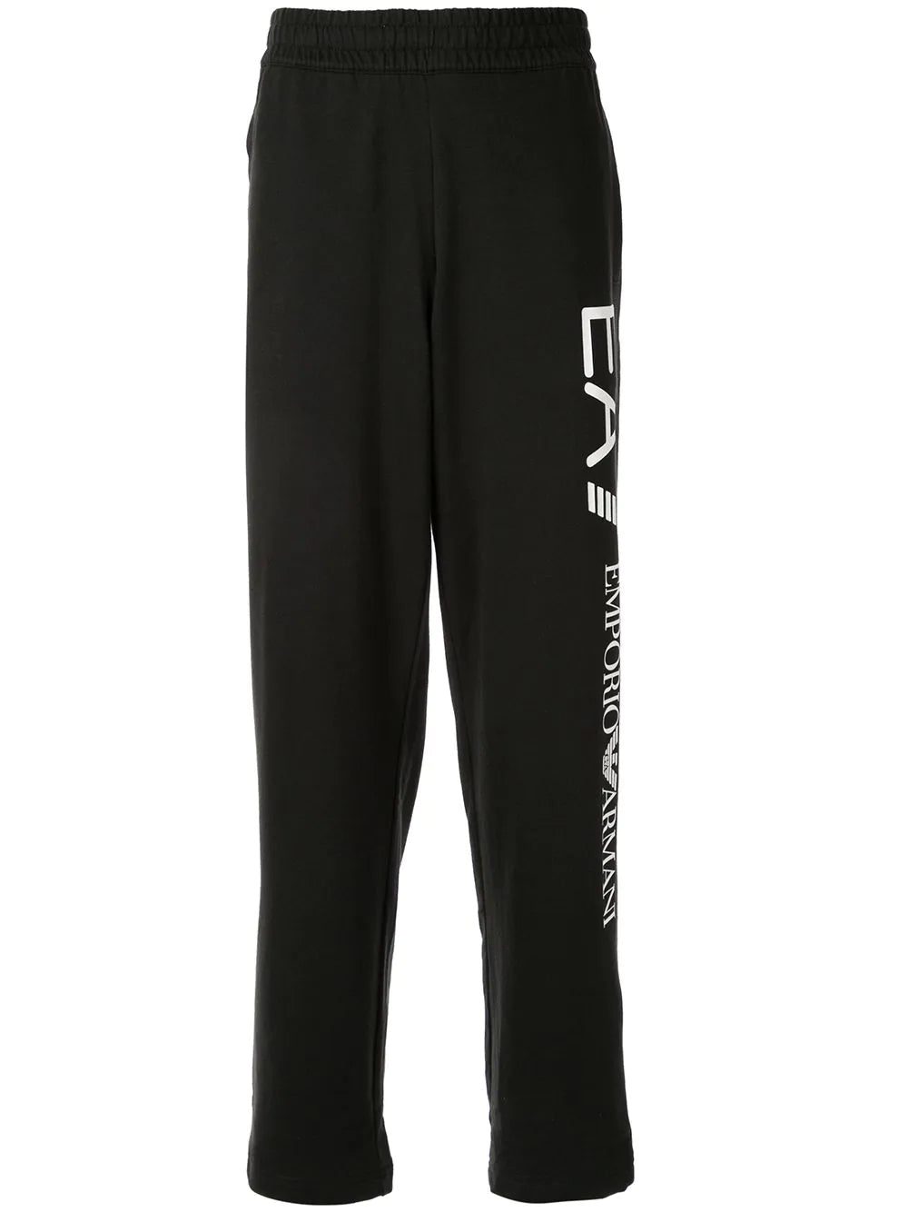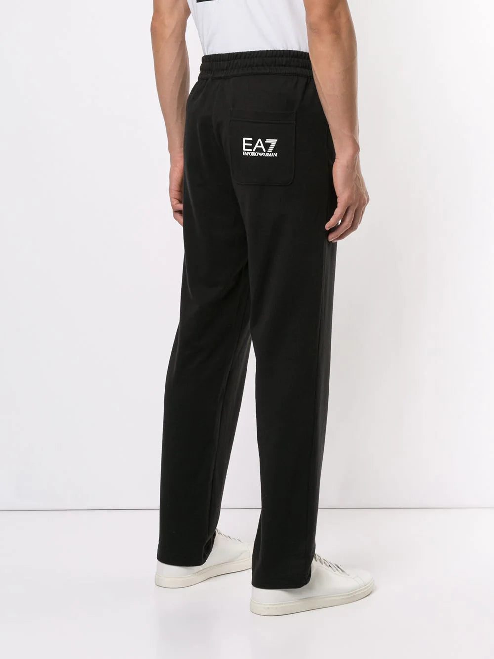Black cotton logo print track pants from Ea7 Emporio Armani featuring a long length, a straight leg, an elasticated waistband and two front pockets.