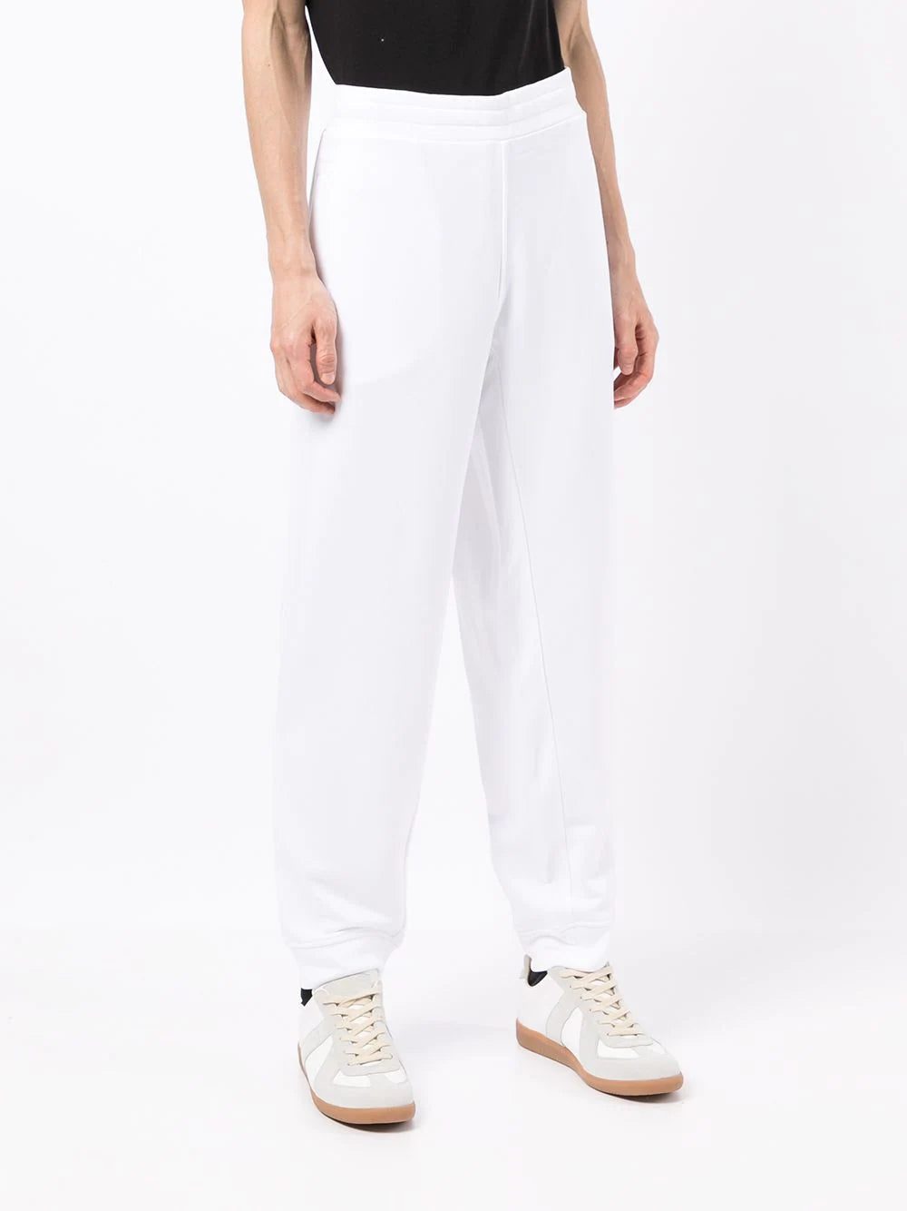 White cotton-blend high-waisted wide-leg trackpants from EMPORIO ARMANI featuring elasticated waistband, wide leg, high-waisted, two side slash pockets and rear patch pocket.