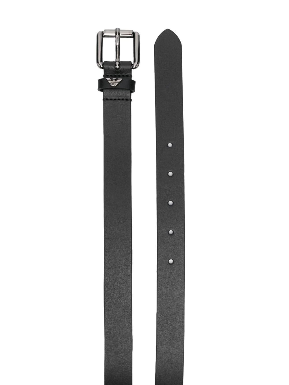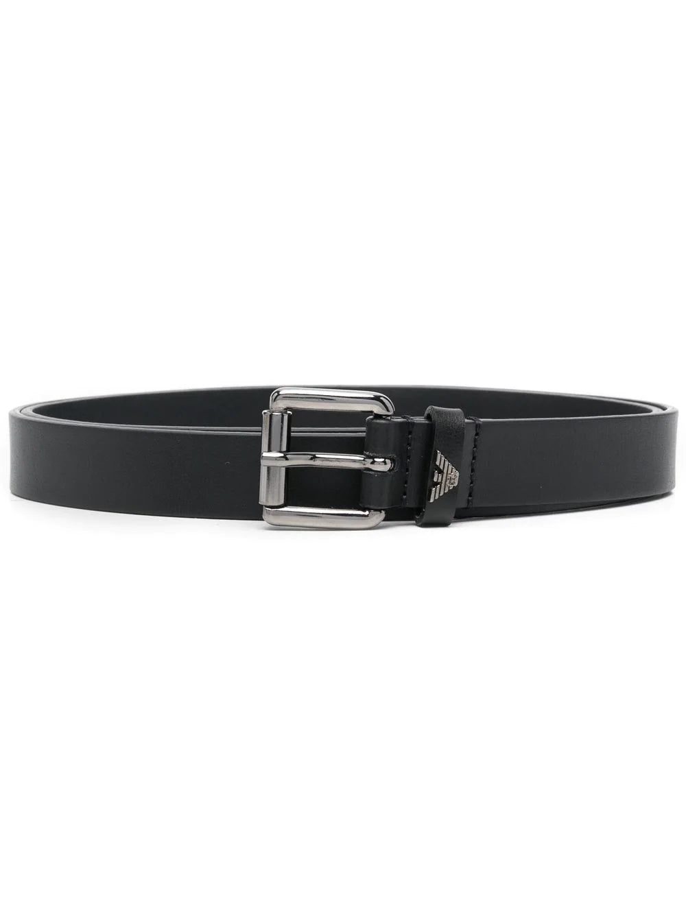 logo buckle belt from EMPORIO ARMANI featuring black, calf leather, logo plaque, buckle fastening and adjustable fit.