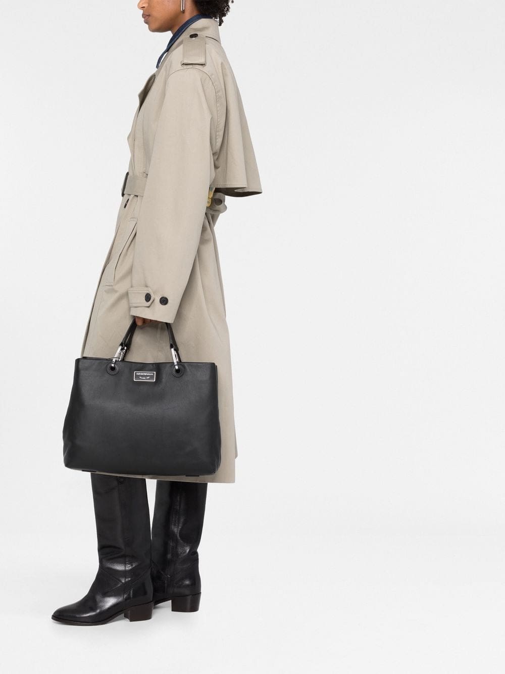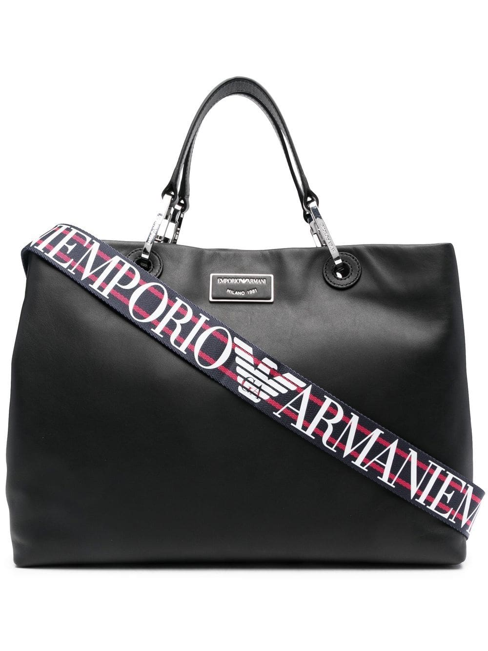 Arriving in a classic tote design, this Emporio Armani bag is crafted from black calf leather and minimally accented with a tonal logo plaque on the front.