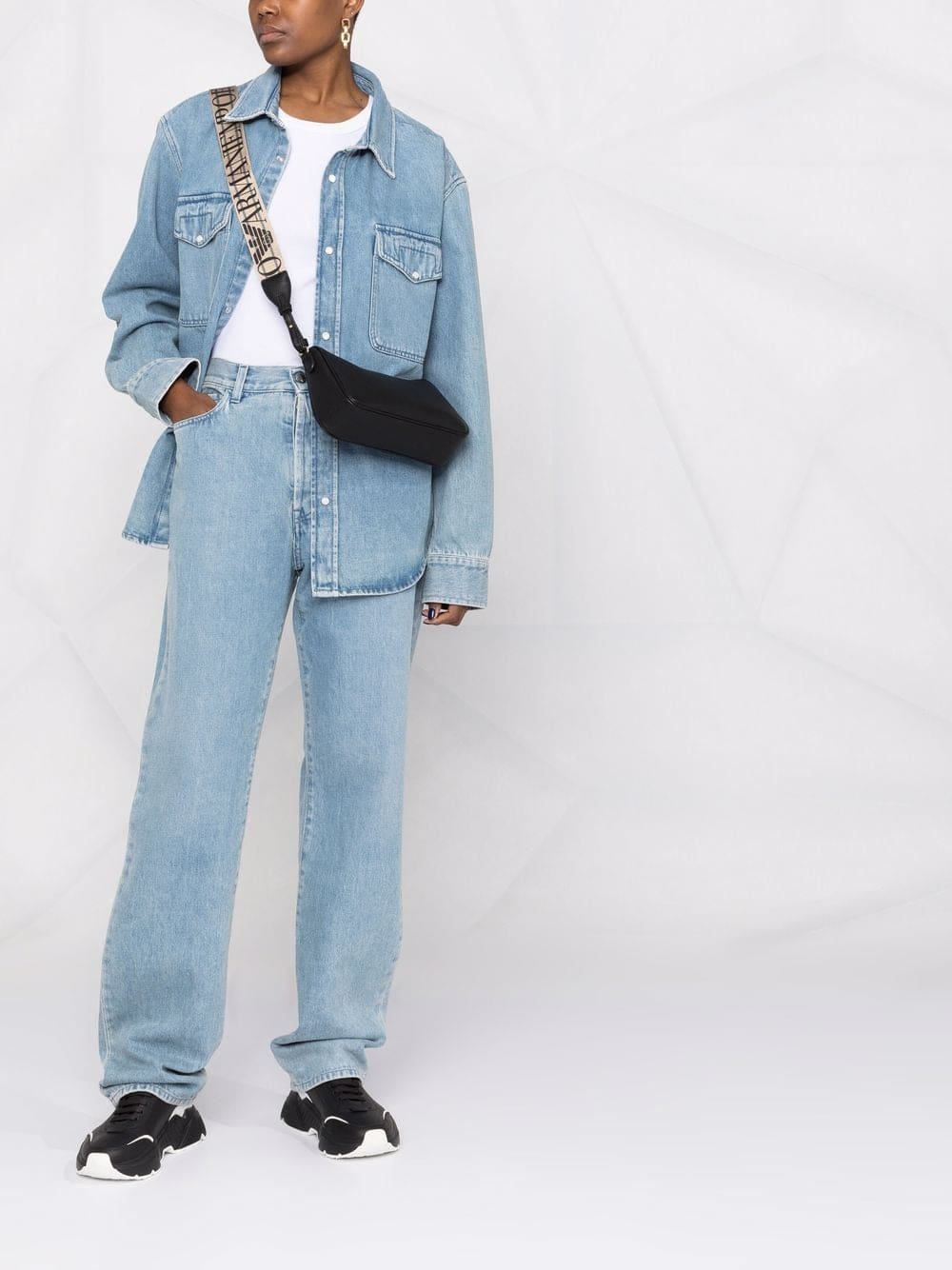 Emporio Armani takes a minimal approach to this classic shoulder bag design, crafted from black pebbled-grain faux-leather. Branded through the sleek gold-tone stamp to the front, the logo-print shoulder strap adds charm to the piece.