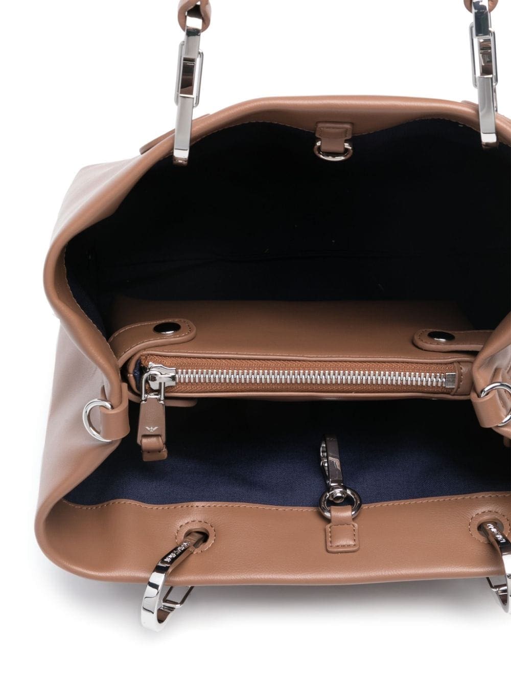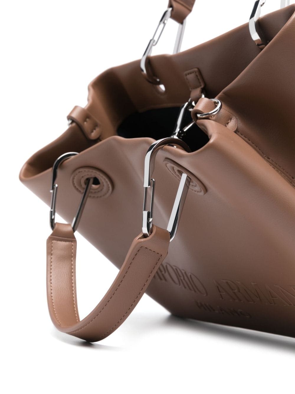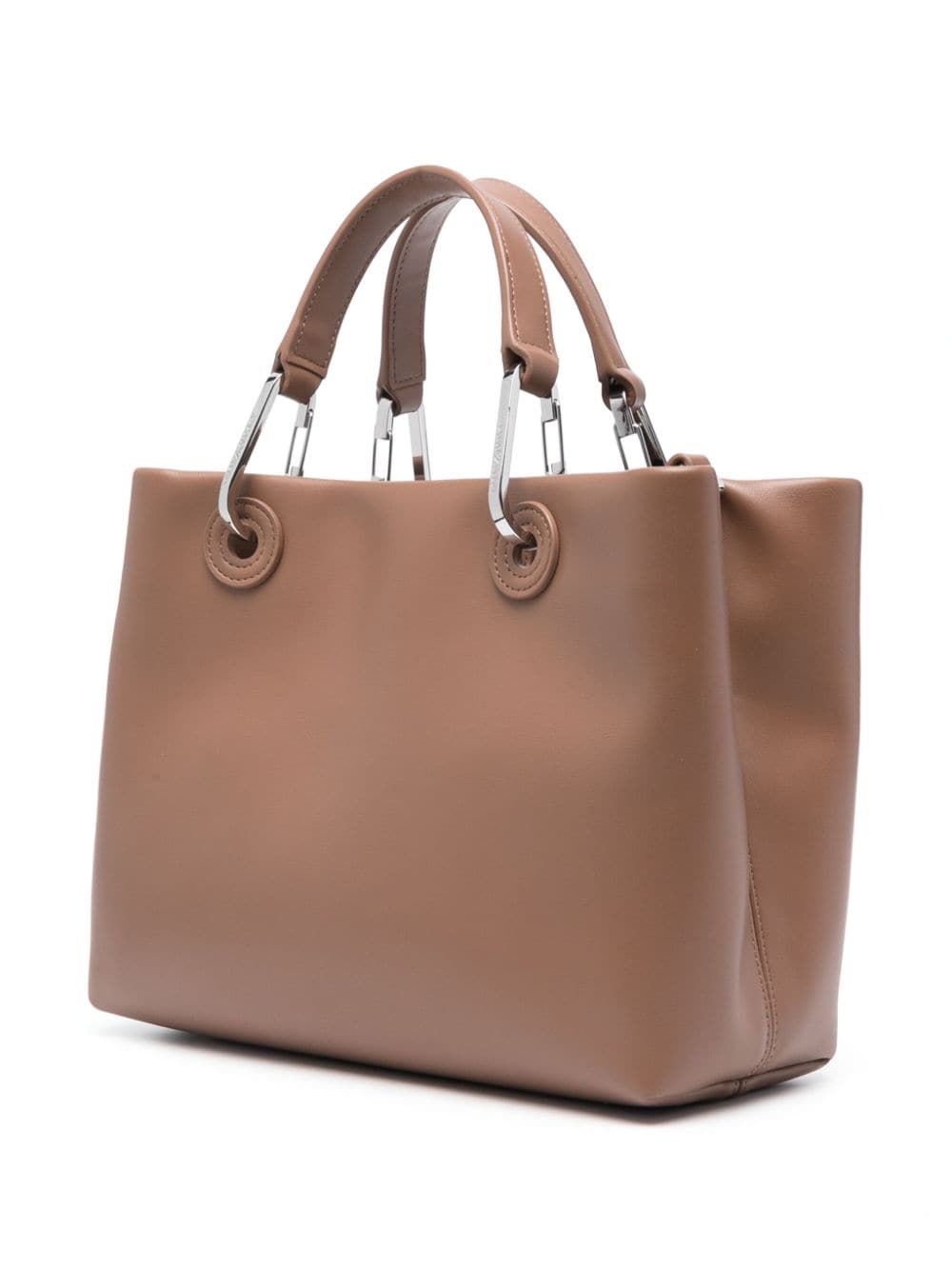 Emporio Armani’s small MyEA tote bag is crafted from brown faux leather to a shopper silhouette then embossed with a moniker across the front. It comes with a removable internal pouch partition and detachable straps.
