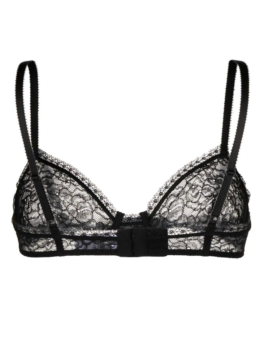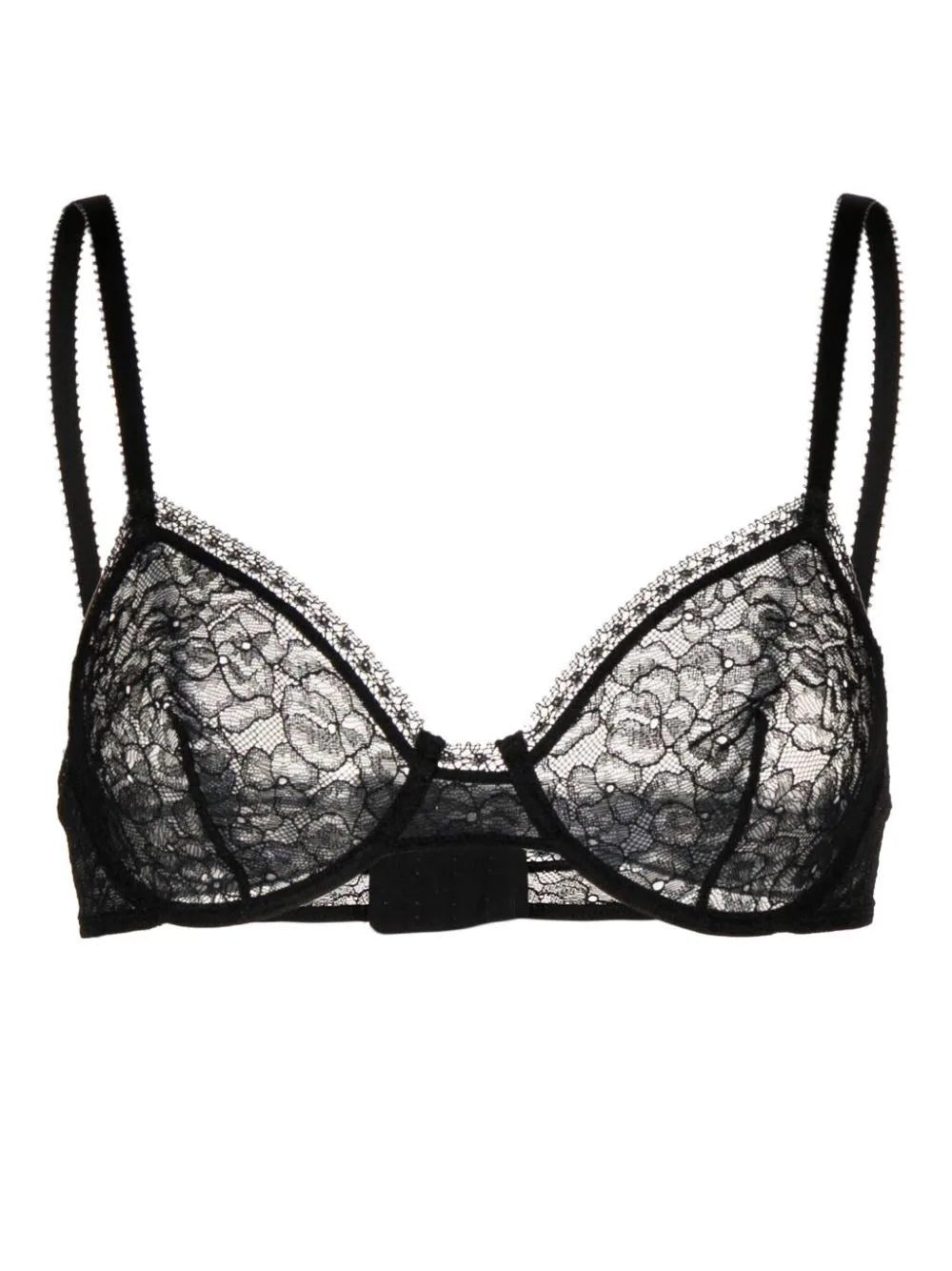 Renowned for their effortlessly romantic designs, French brand ERES presents the Tendresse bra: imagined in a classic black. It is covered with a floral lace pattern for a delicate look.