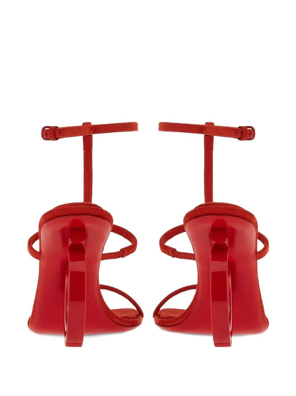 Ferragamo's Elina sandals offer a contemporary take on classic styles. Set on a sculptural heel shaped into the brand's iconic Gancini motif, this red suede pair has a caged design.