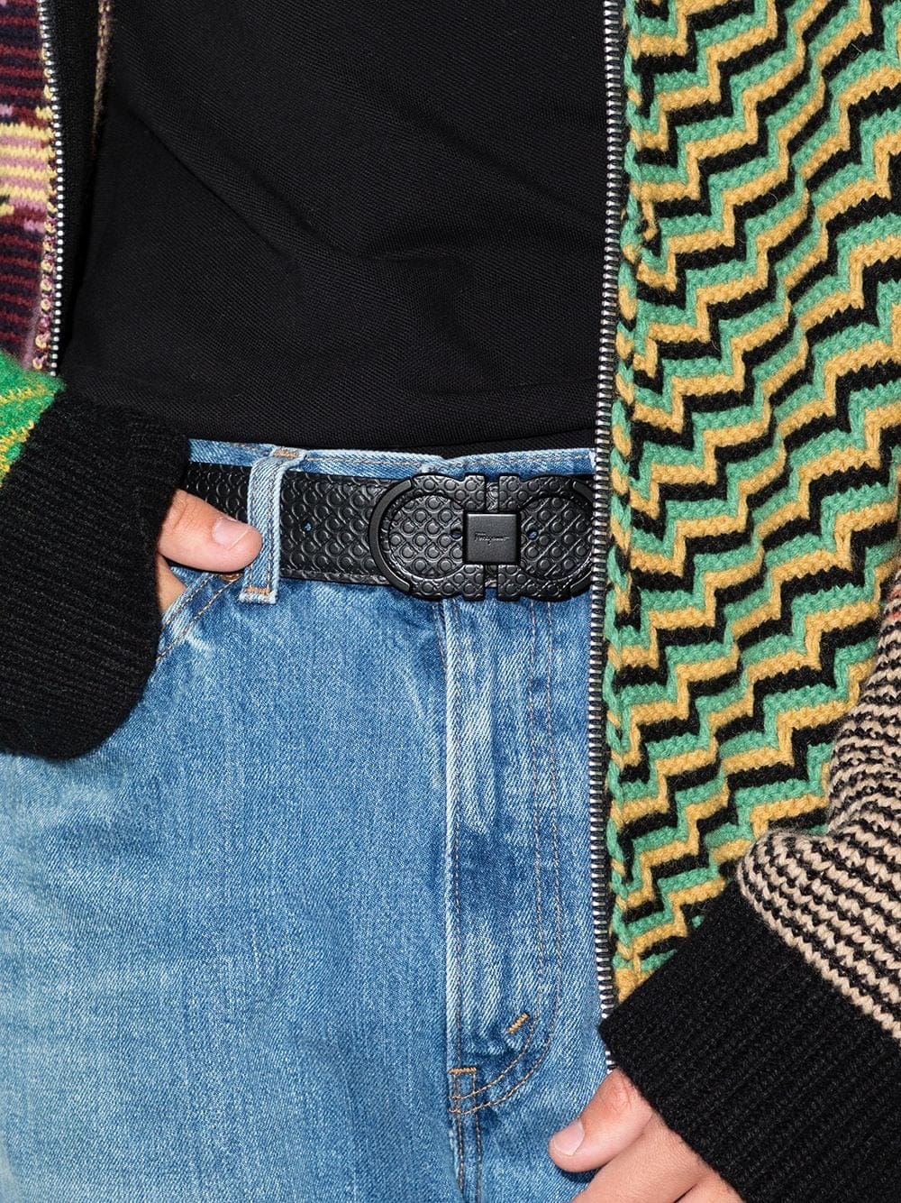 Inspired by the hooks used for attaching horse's holsters, Ferragamo's Gancini takes centre stage at this striking belt in the form of a tonal black buckle. Crafted from leather, it is finished with an embossed pattern showcasing the very same motif.