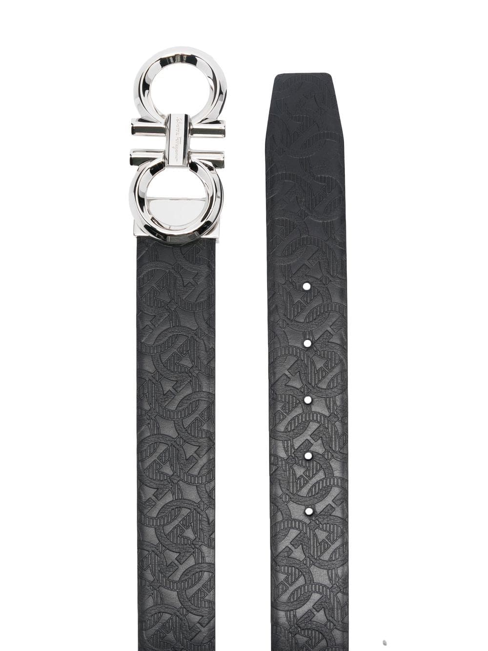 black calf leather debossed monogram pattern silver-tone buckle fastening punched holes adjustable fit