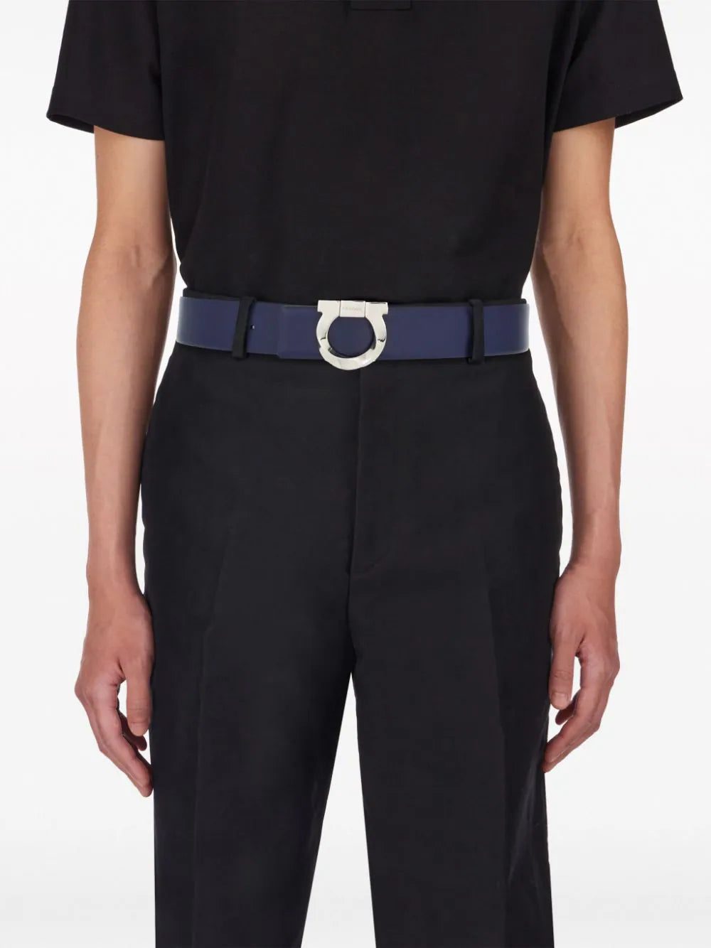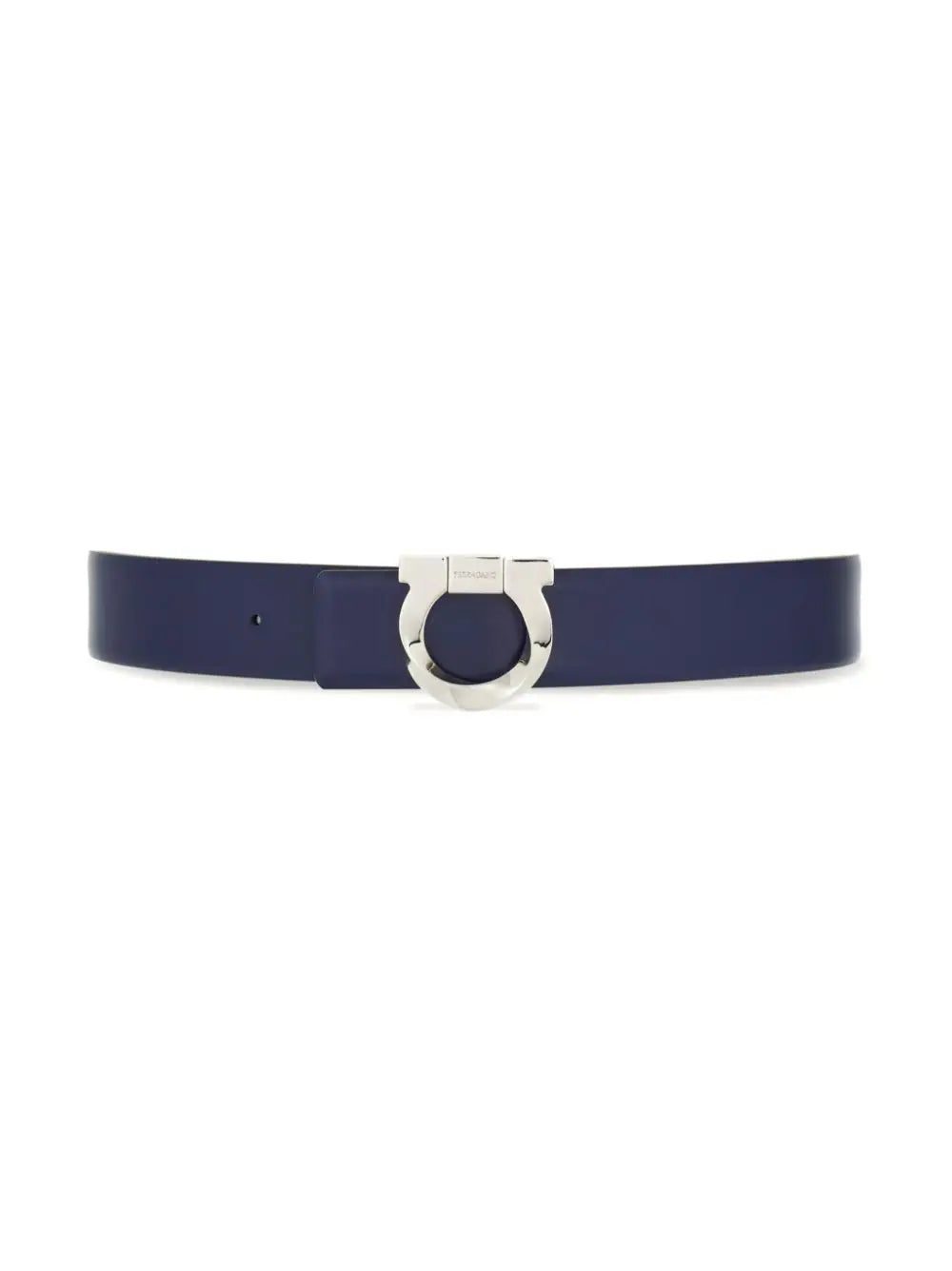 Inspired by the motifs found in Ferragamo's house gate in Florence, the Gancini has become synonymous with tradition, heritage and artisanship. It adorns the smooth calfskin design of this reversible calfskin belt, made in Italy in a black and midnight blue colourway.
