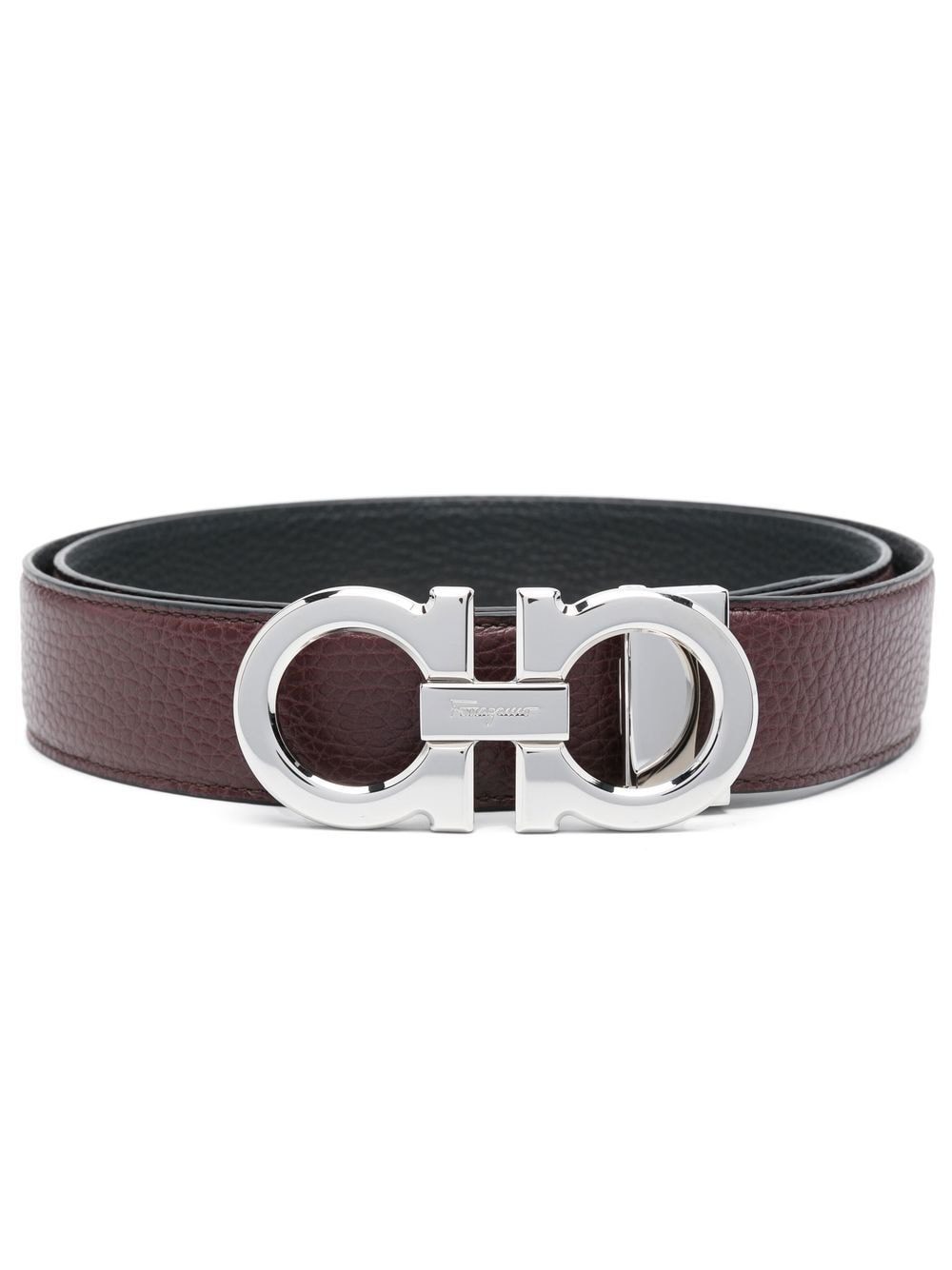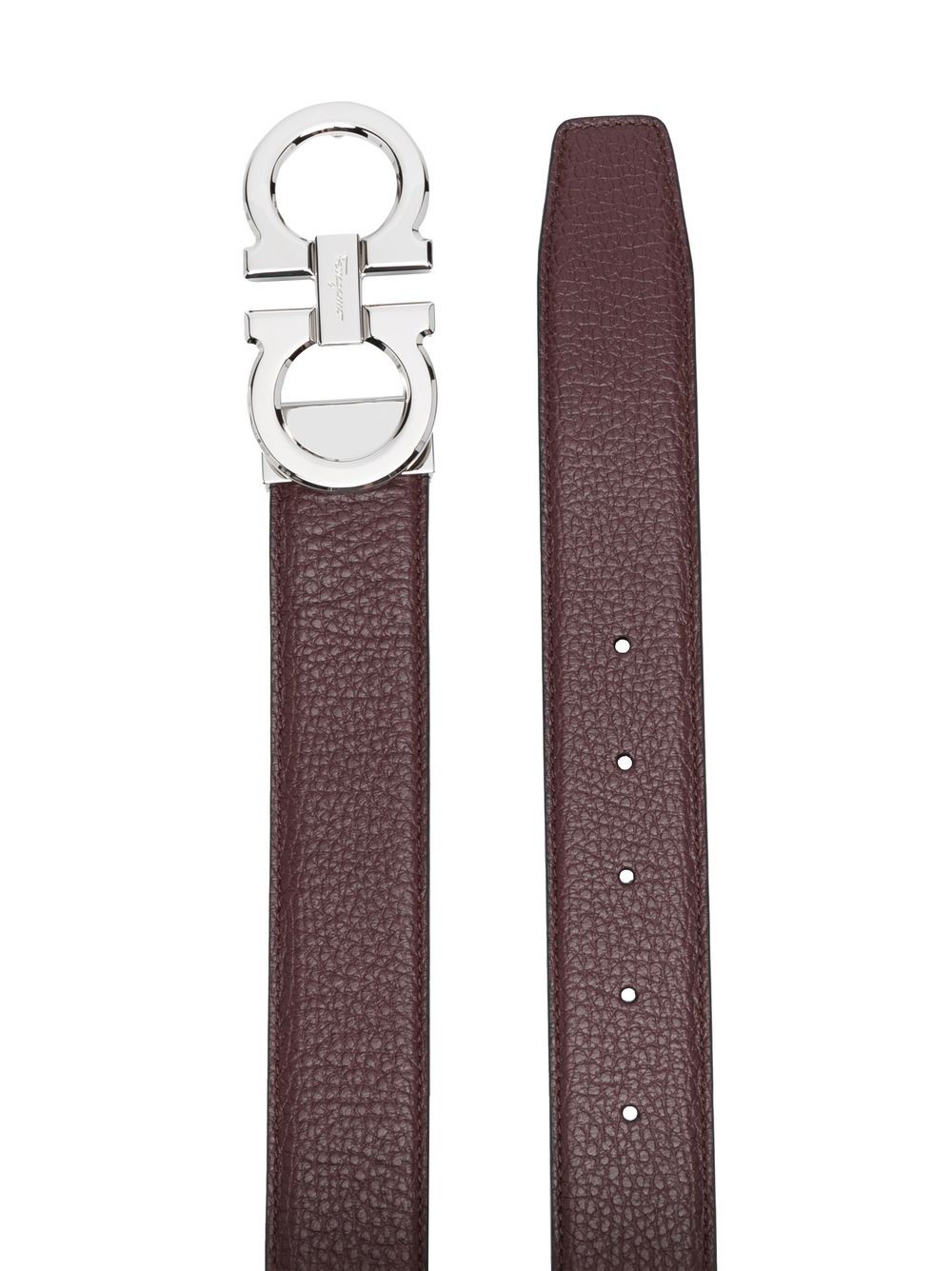 Gancini reversible leather belt from SALVATORE FERRAGAMO featuring dark purple, black, calf leather, grained texture, two-tone design, reversible, Gancini buckle, silver-tone hardware, punched holes and adjustable fit.