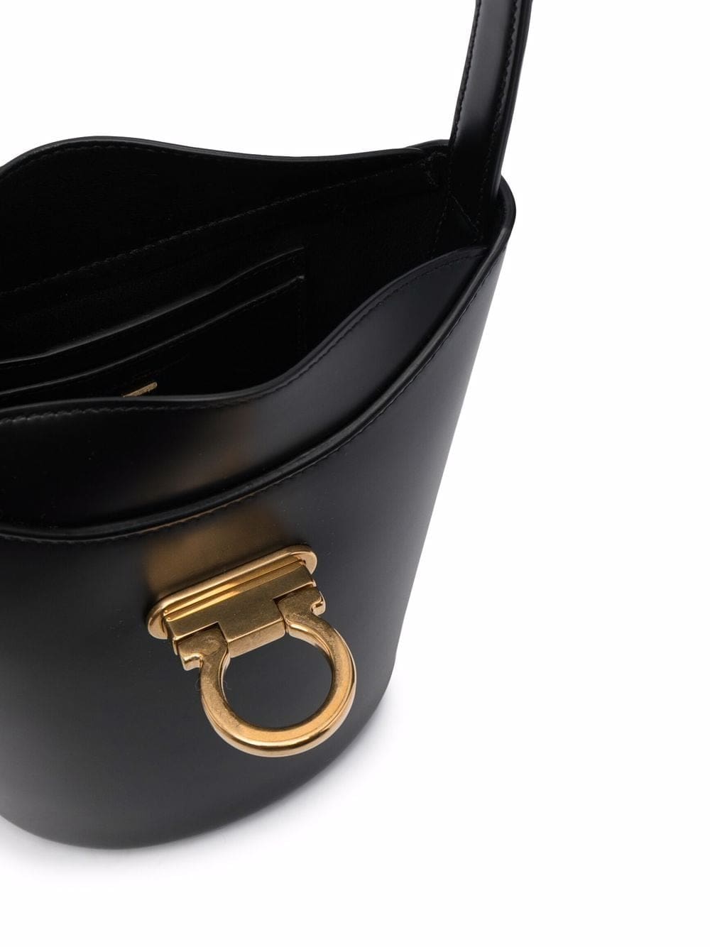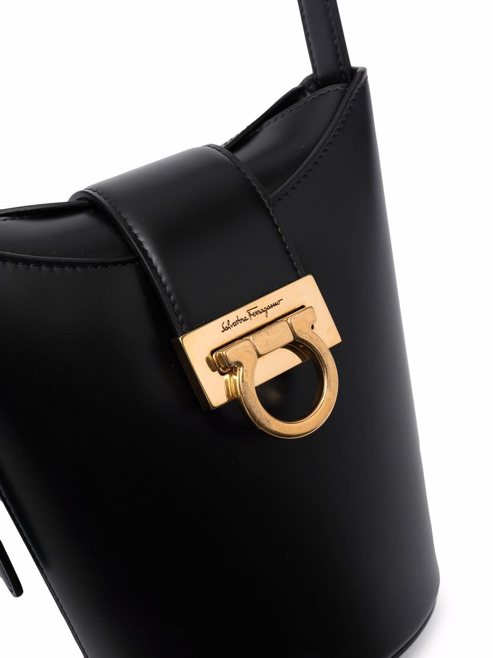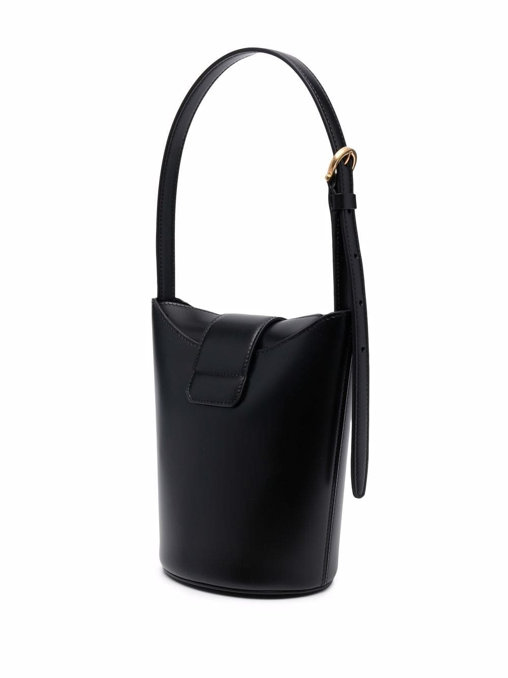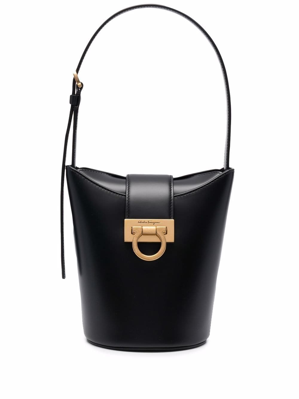 black calf leather engraved logo gold-tone hardware buckle fastening foldover top adjustable shoulder strap