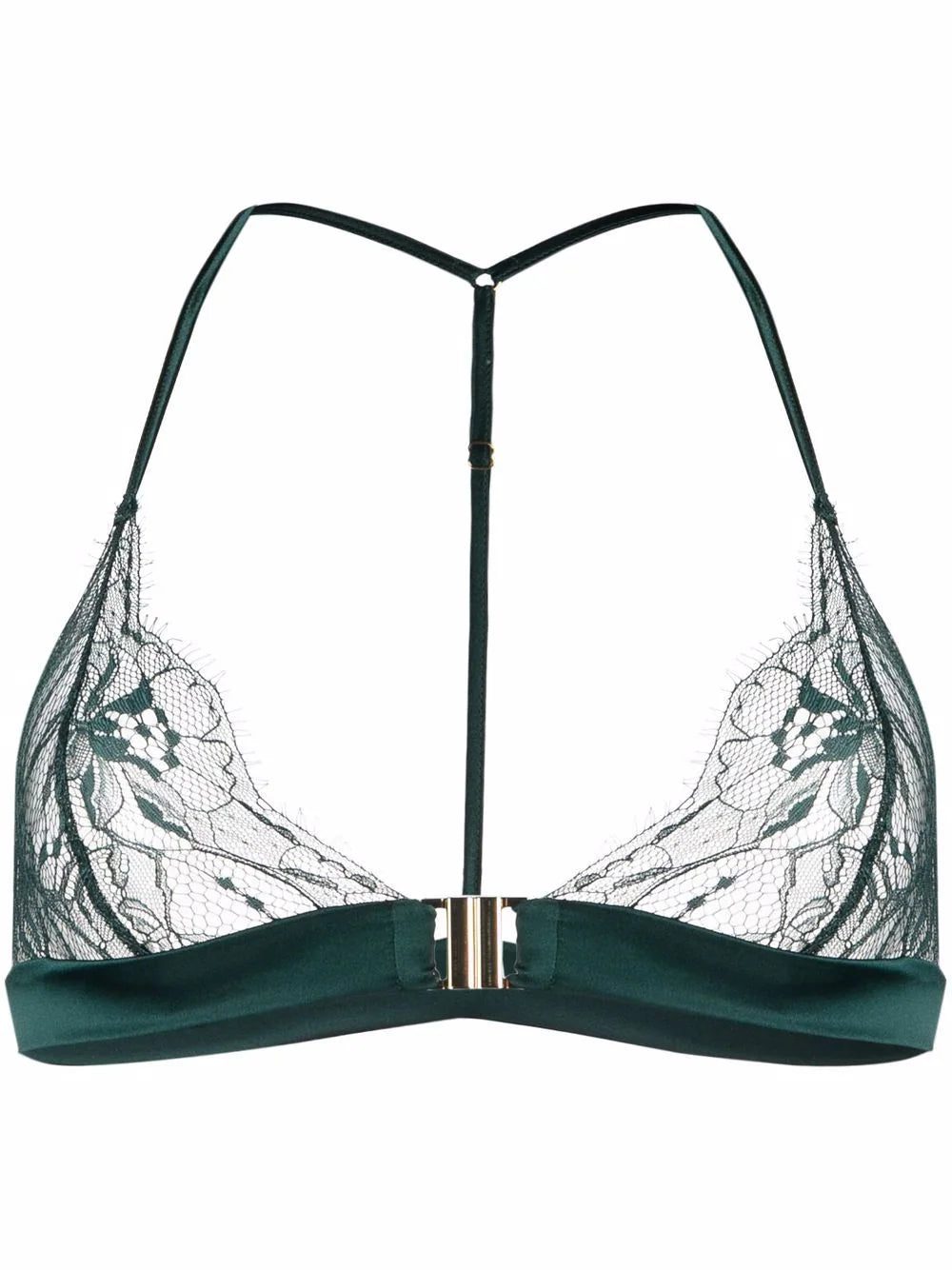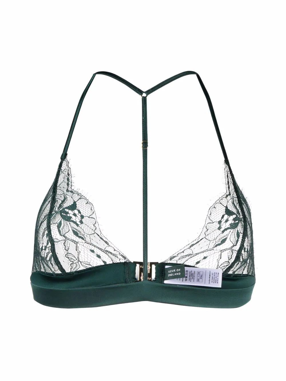 emerald green silk blend lace trim T-bar strap front clasp fastening