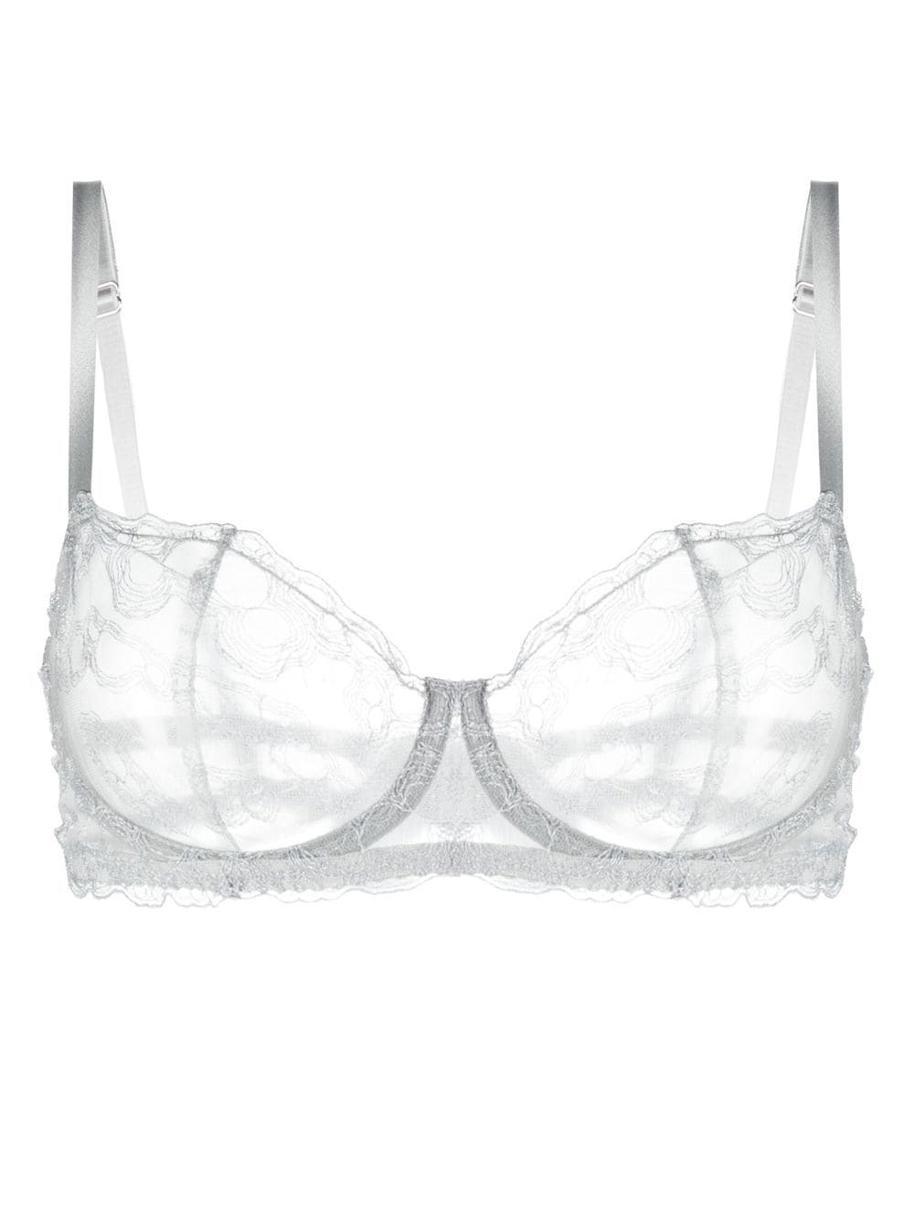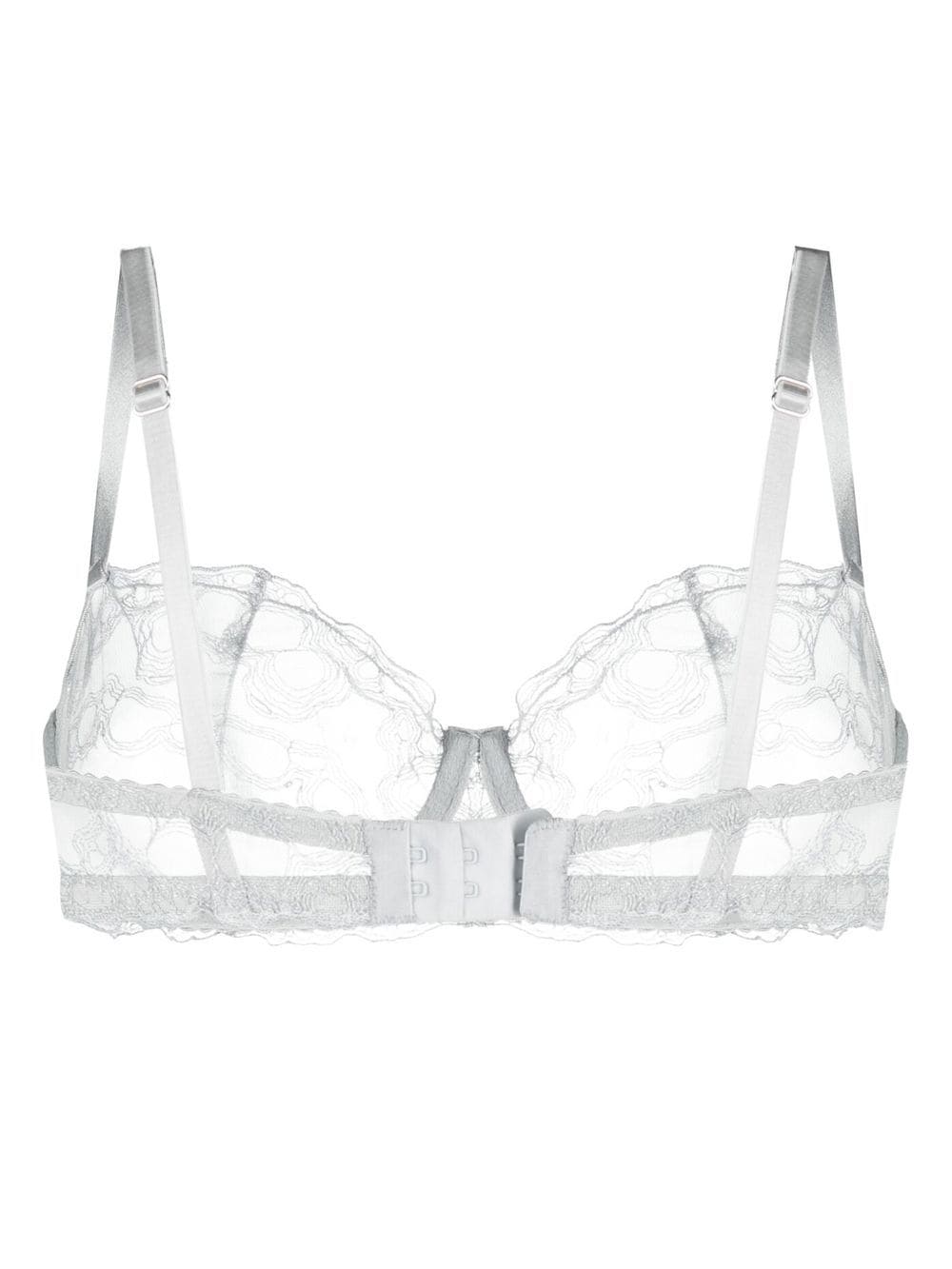 light grey sheer balconette style lace panelling adjustable spaghetti straps rear hook fastening