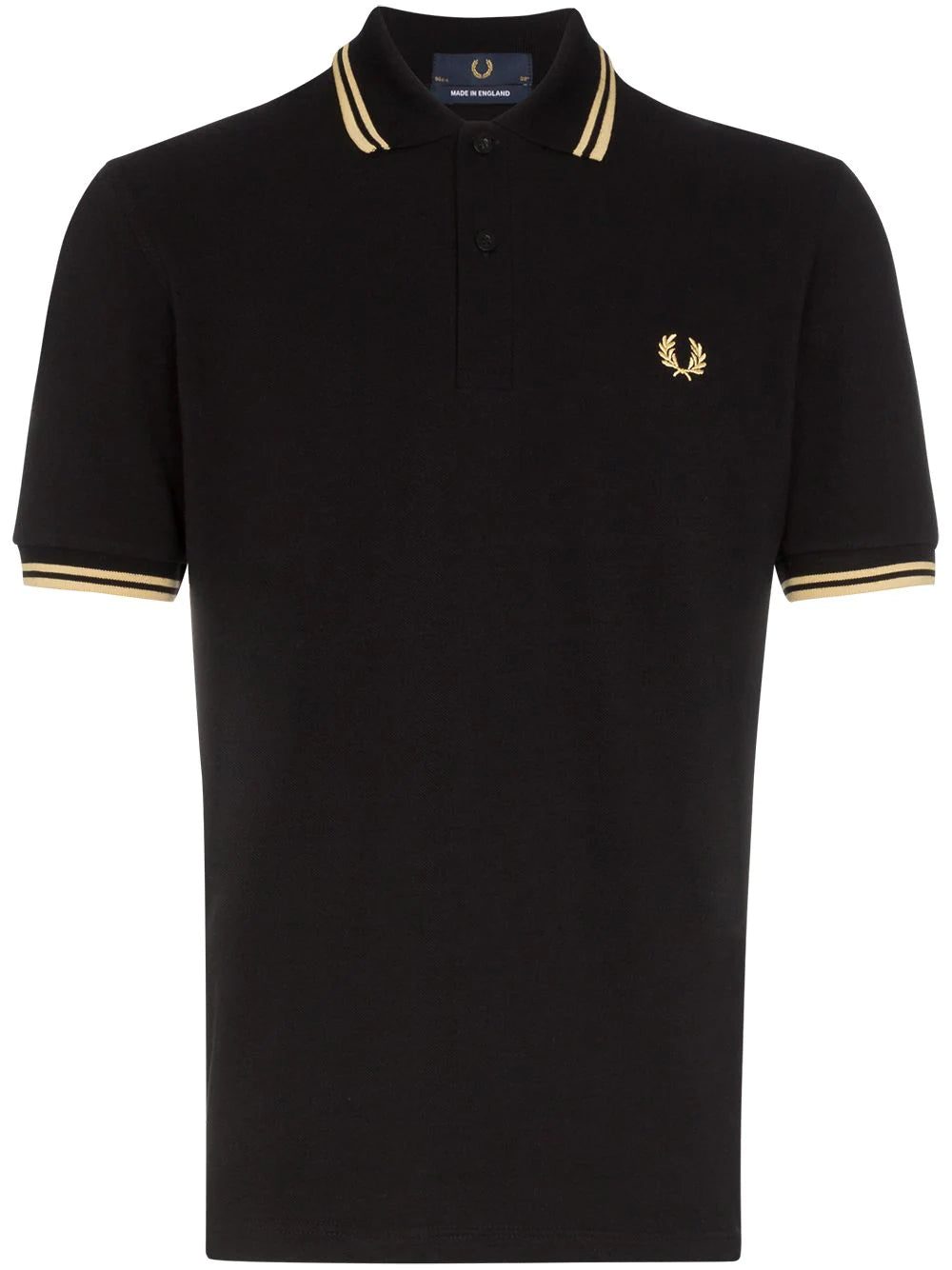Black cotton stripe-trimmed polo shirt from Fred Perry featuring a classic polo collar, a button fastening, short sleeves, a logo to the chest, a straight hem, striped trims and logo embroidery.
