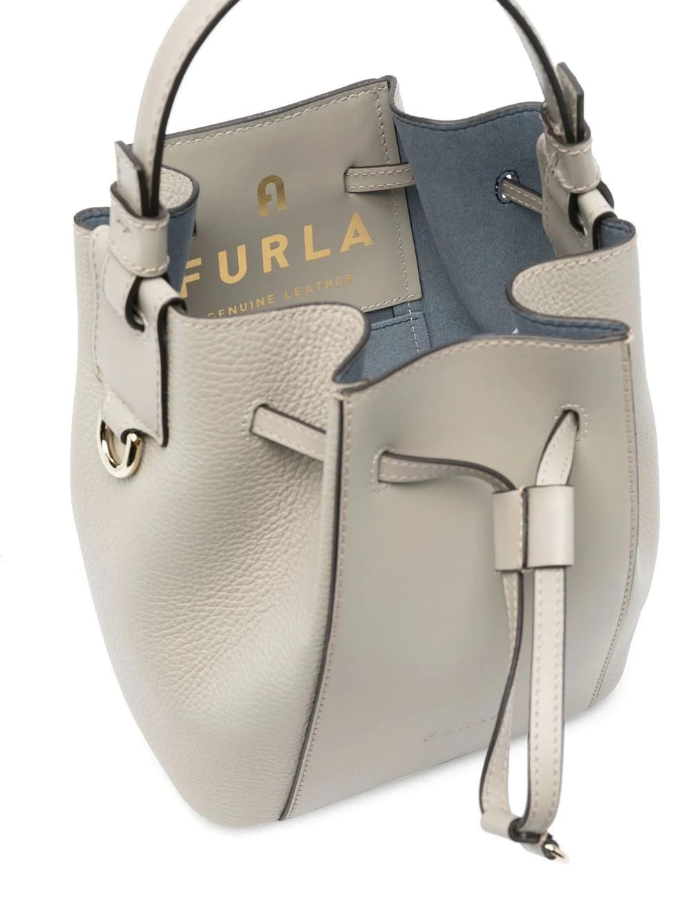 calf leather bucket bag from FURLA featuring grey, calf leather, drawstring fastening, single flat top handle, adjustable detachable shoulder strap and main compartment.