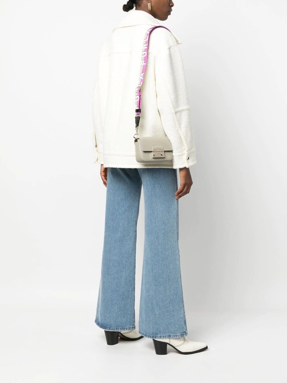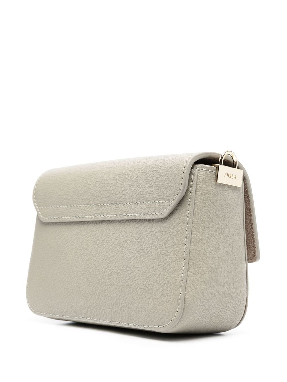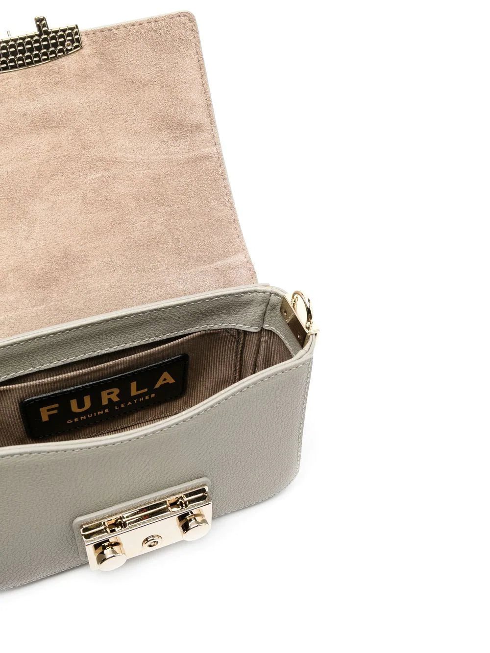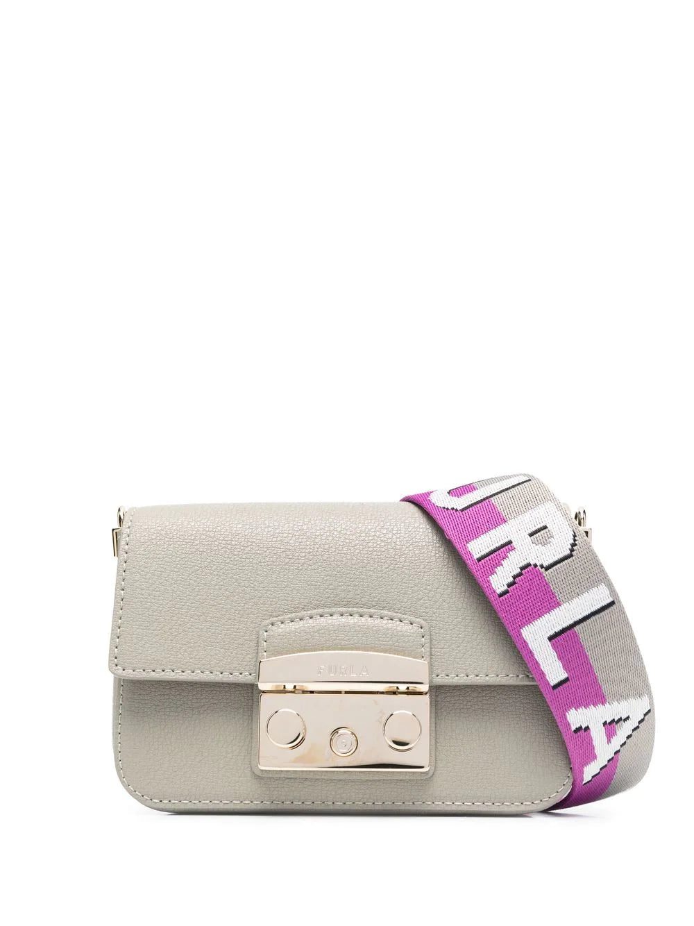 Metropolis mini crossbody bag from FURLA featuring light grey, leather, foldover top, snap-fit fastening, gold-tone hardware, engraved logo, main compartment, internal slip pocket and adjustable detachable shoulder strap.
