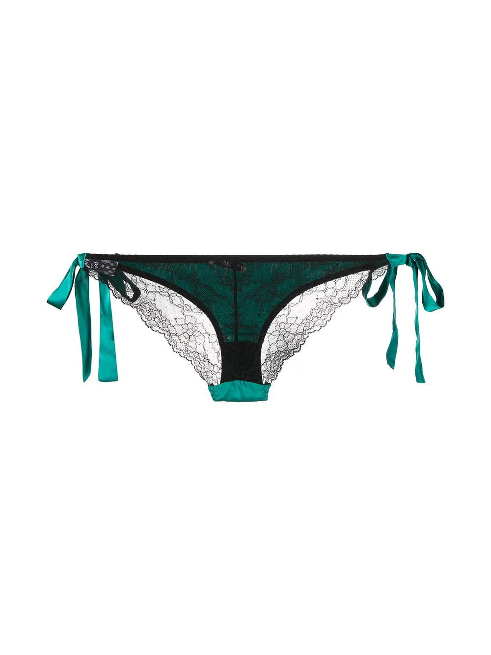 Jade green silk Eva lace panel knicker from Gilda & Pearl featuring a low rise, side tie fastenings and a satin finish. POSITIVELY CONSCIOUS: Gilda & Pearl scores 3 out 5 by independent ethical brand rating agency Good On You. It has a good animal rating and does not use fur, leather, wool, down, exotic animal skin or angora. It traces most of its supply chain manufacturers locally to reduce its carbon footprint.