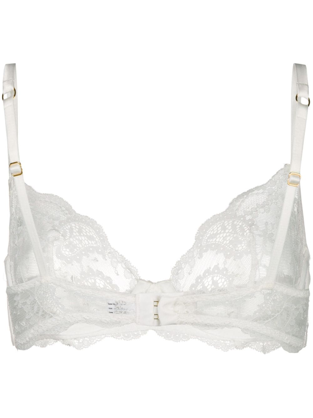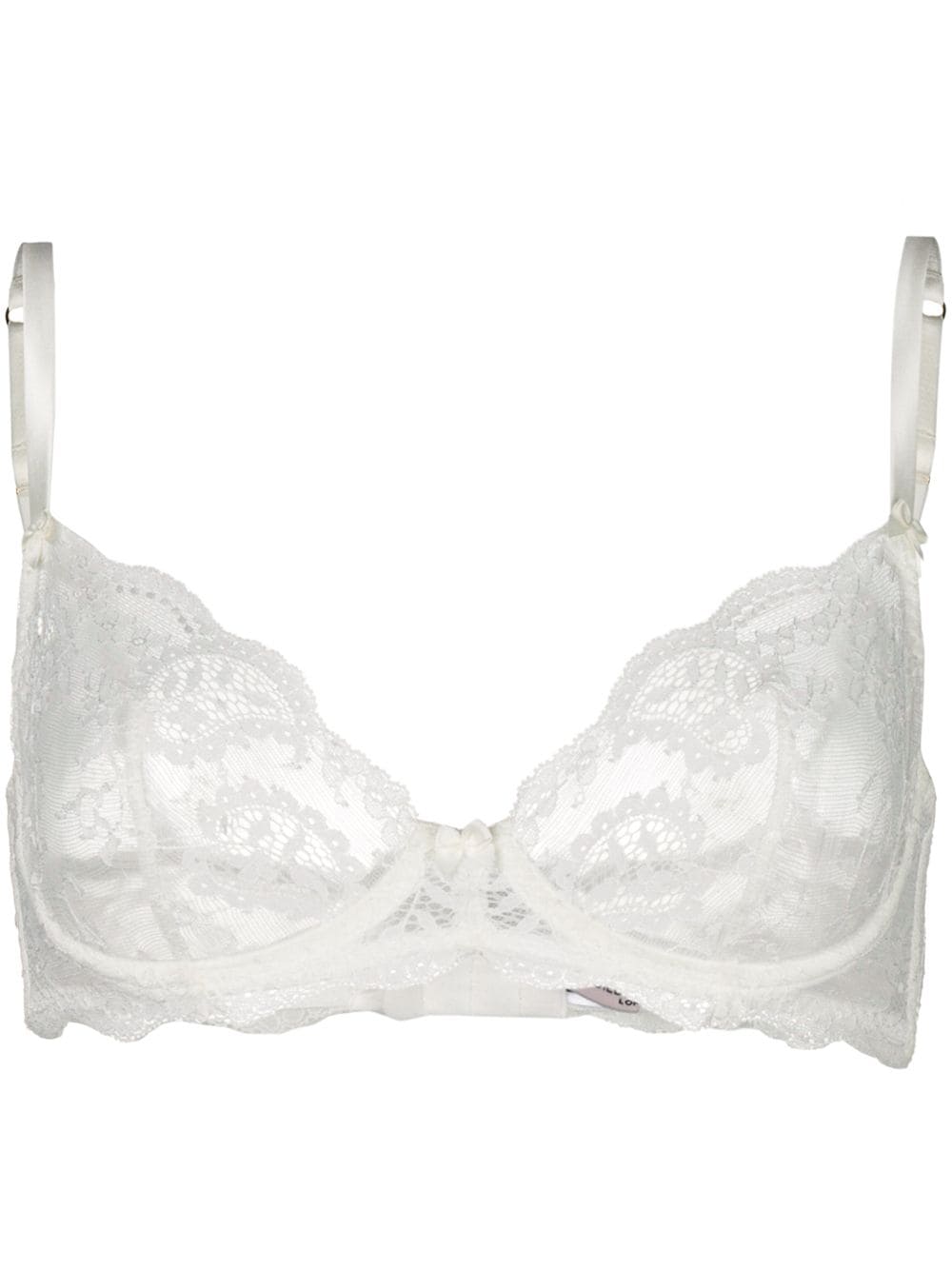 White Rita balconette bra from Gilda & Pearl featuring lace inserts, underwired cups, adjustable shoulder straps and a rear hook and eye fastening. It is essential that you try underwear and lingerie over your own garments. We trust you to follow the rules. POSITIVELY CONSCIOUS: Gilda & Pearl scores 3 out 5 by independent ethical brand rating agency Good On You. It has a good animal rating and does not use fur, leather, wool, down, exotic animal skin or angora. It traces most of its supply chain manufactures locally to reduce its carbon footprint.