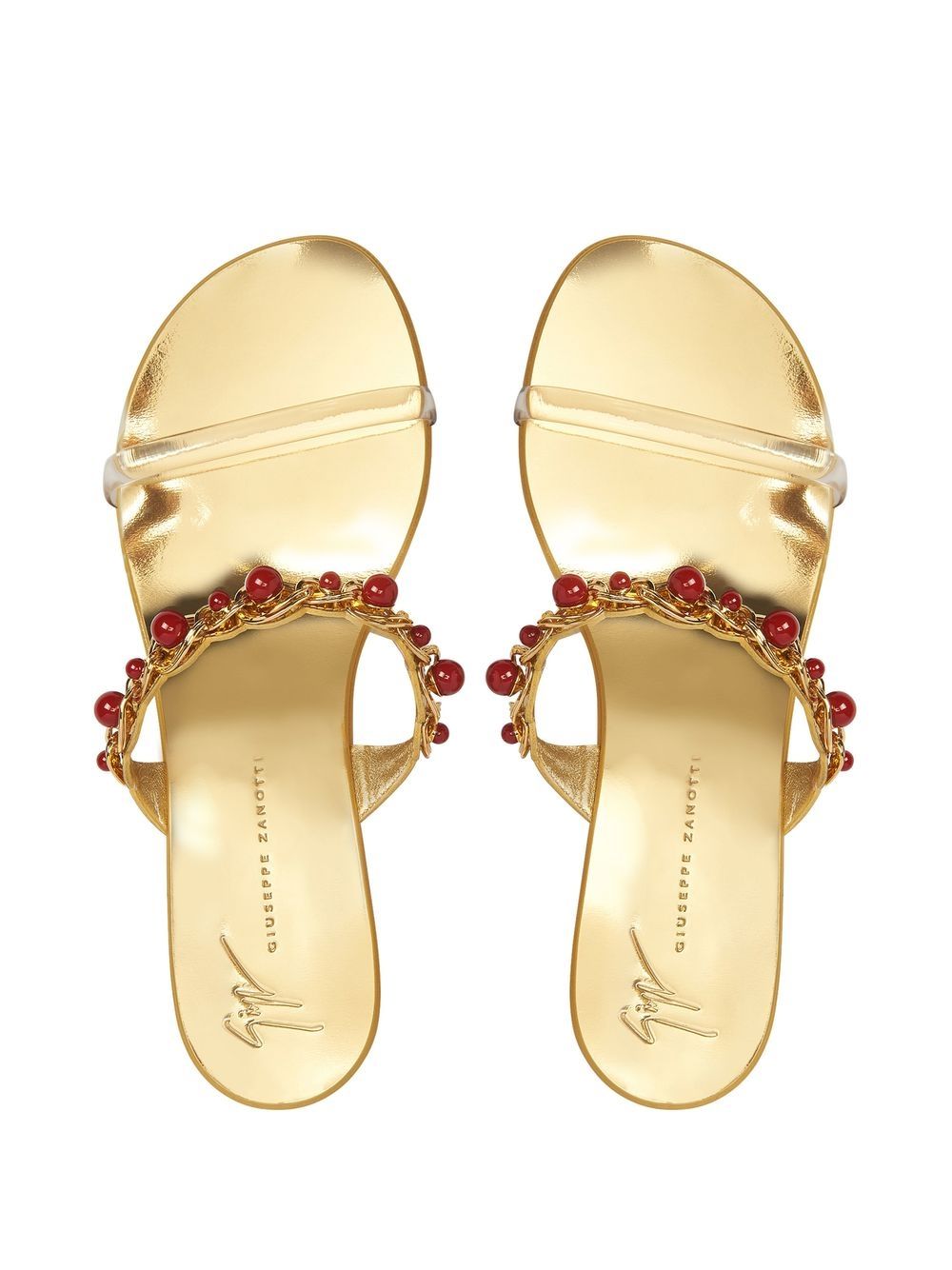 Crafted from smooth leather in a gold tone, these sandals from Giuseppe Zanotti are detailed with a braided strap at the upper embellished with red beads.