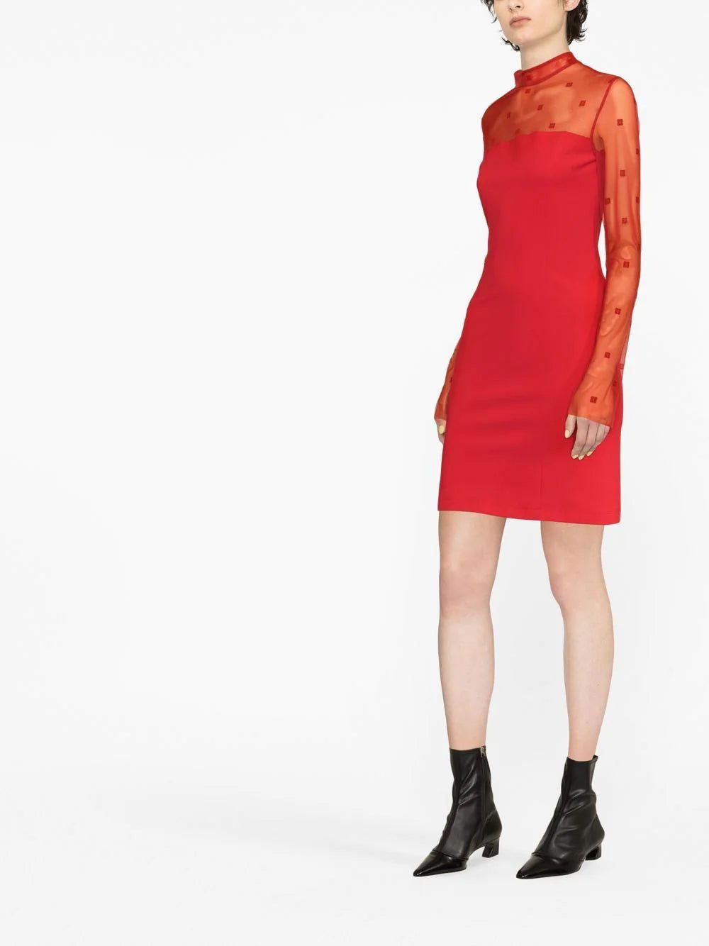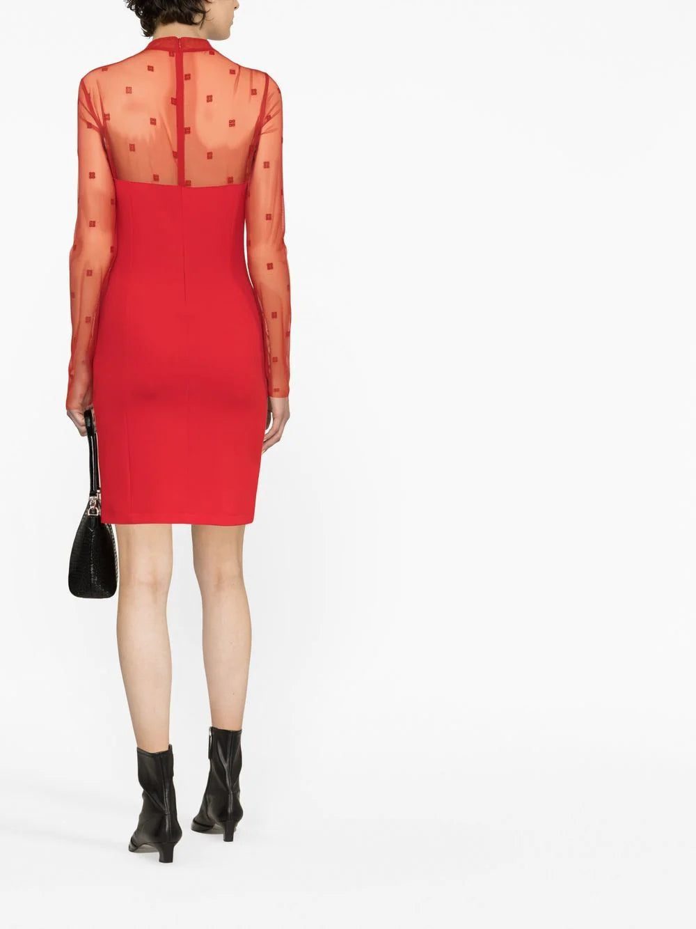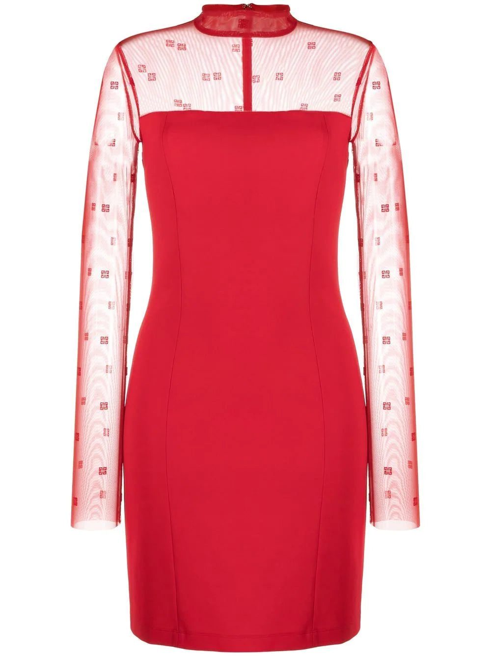 Givenchy's minidress is punctuated with a tulle-panelled bodice that reveals subtle hints of skin. The 4G decoration is a longstanding brand signature.