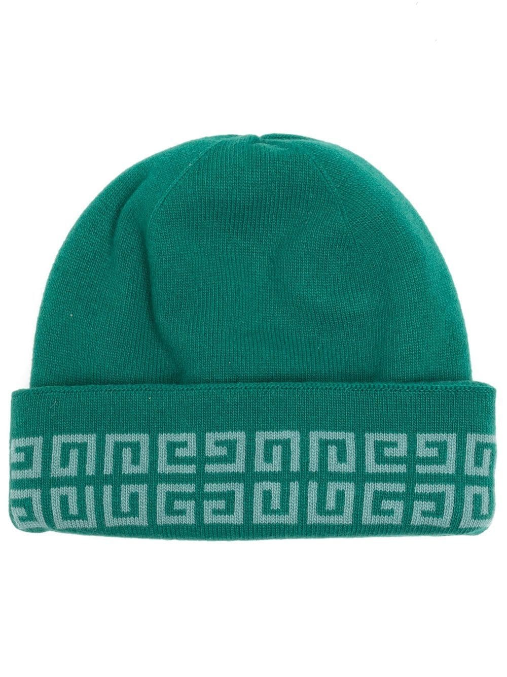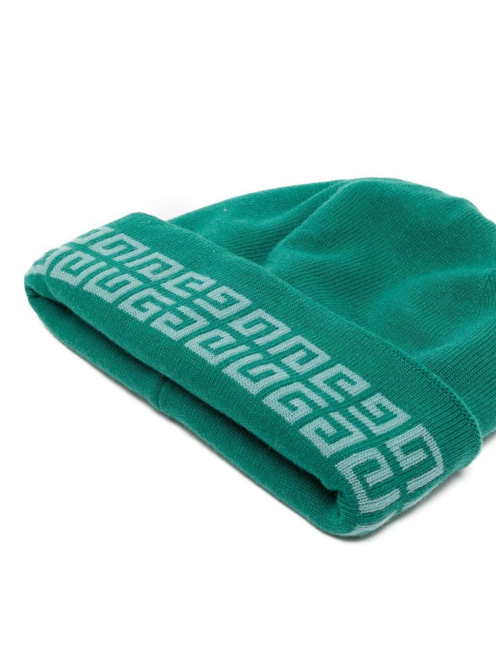 teal green wool-cashmere blend fine ribbed signature Greca-pattern print turn-up brim