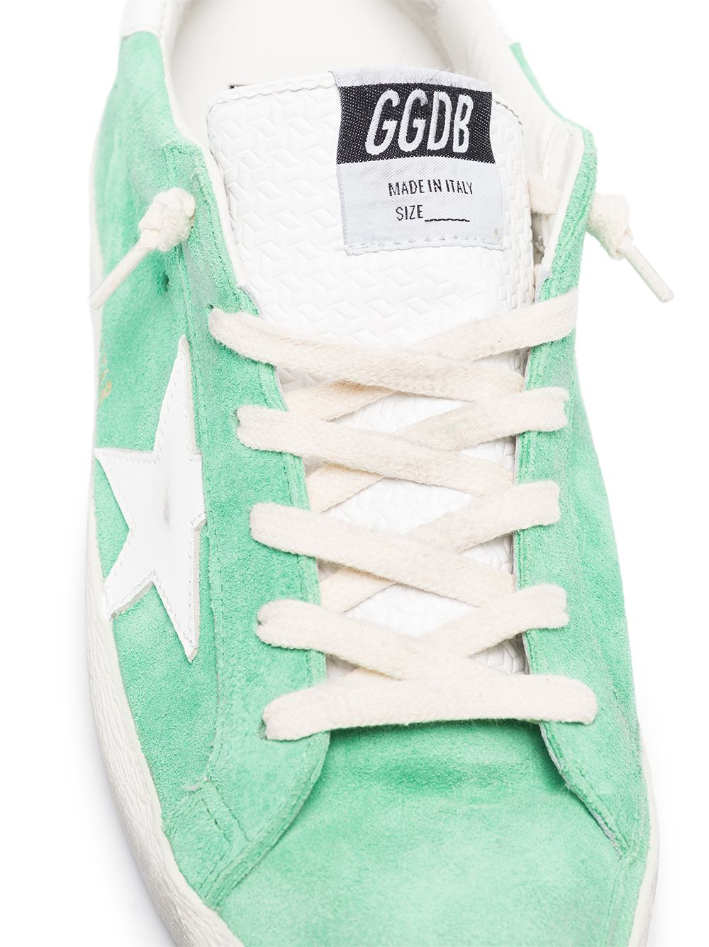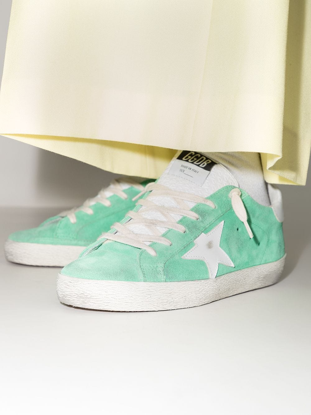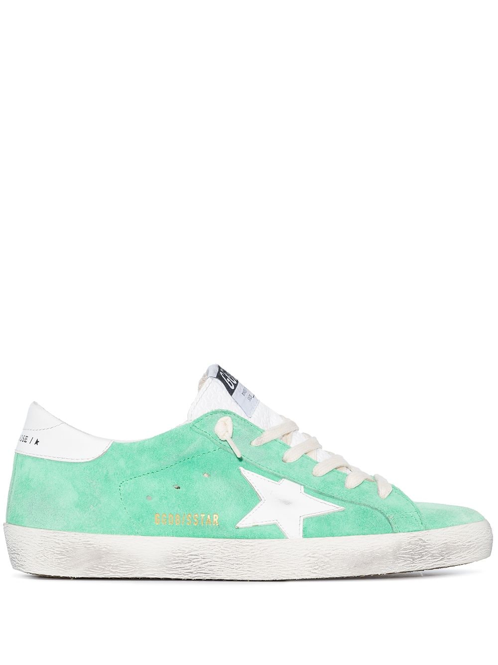 Golden Goose's iconic Super-Star silhouette is reinvented every season in new colourways and materials. The brand's SS22 collection includes this green and white pair, adorned with a signature star patch at the side and boasting a distinct distressed finish.
