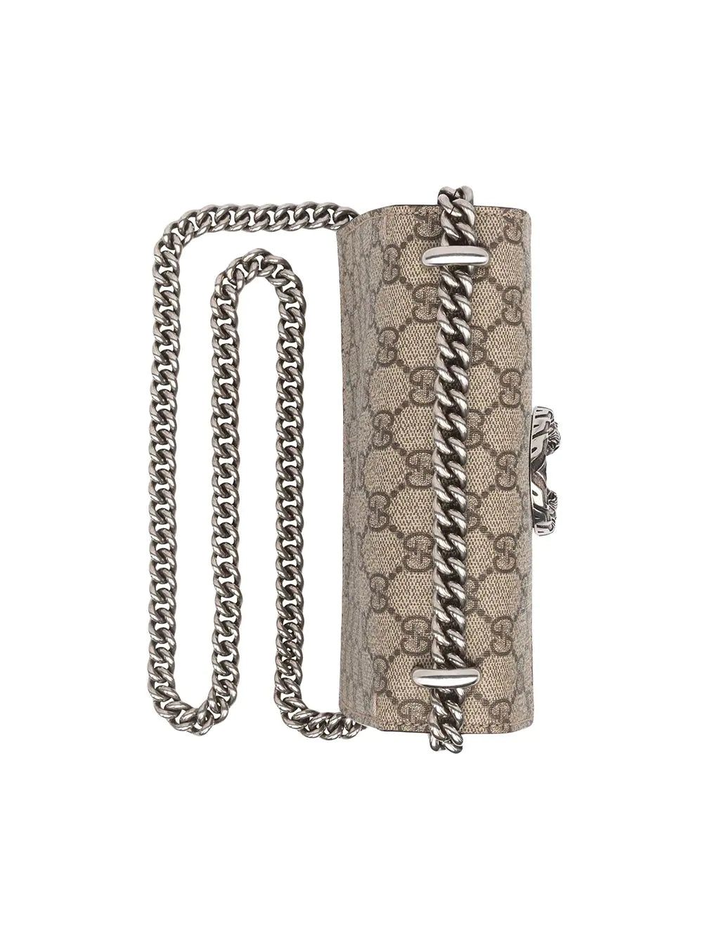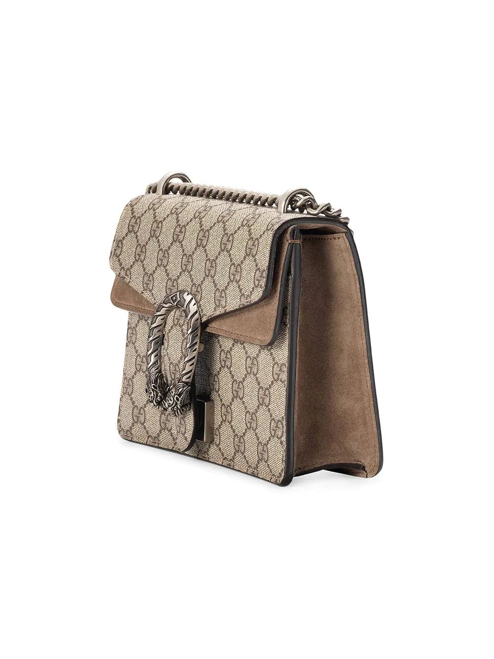 A mini structured bag with our textured tiger head spur closure. The sliding chain strap can be worn multiple ways, changing between a shoulder and a top handle bag. Beige/ebony GG Supreme canvas, a material with low environmental impact, with taupe suede trim. Antique silver toned hardware. For Europe and UAE customers: to personalize this item from your mobile or tablet please contact us at +44 (0) 207 495 1445. Tiger head spur. Hand-painted edges. Hand-stitched details. Pocket under the flap. Sliding chain strap can be worn as a shoulder strap with 40cm drop or can be worn as a top handle with 23cm drop. Pin closure with side release. Mini size: W20cm x H15.5cm x D5cm. Made in Italy.